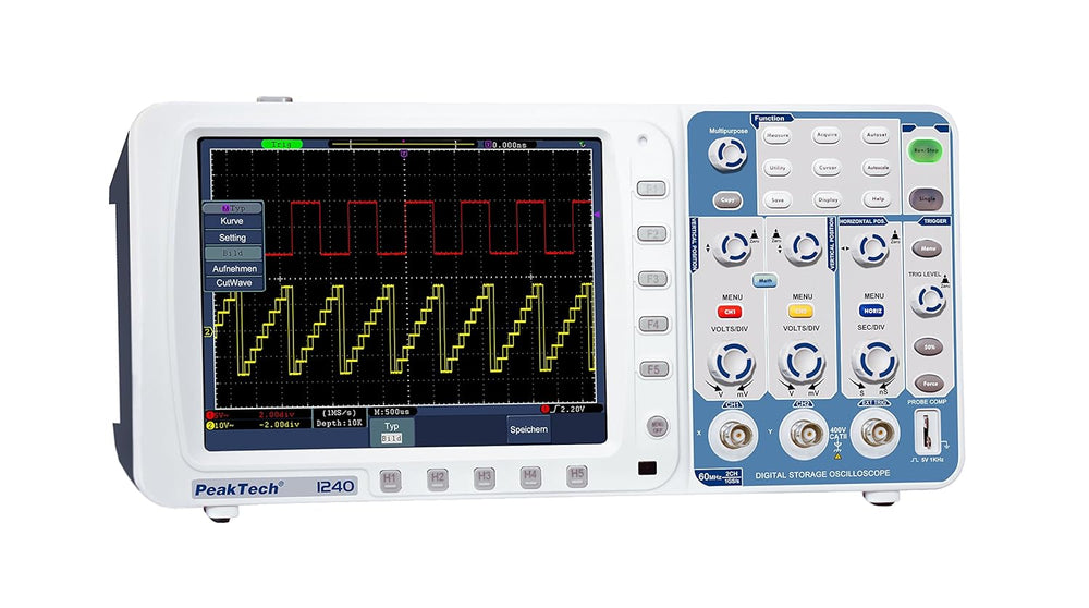 - HOHE SPEICHERTIEFE: Das neu-designte 2 Kanal-Oszilloskop mit übersichtlichem 8“ TFT-Farbdisplay verfügt über eine interne Speichertiefe von 10.000.000 Punkten pro Kanal (1) oder 15 Wellenformen