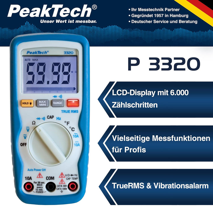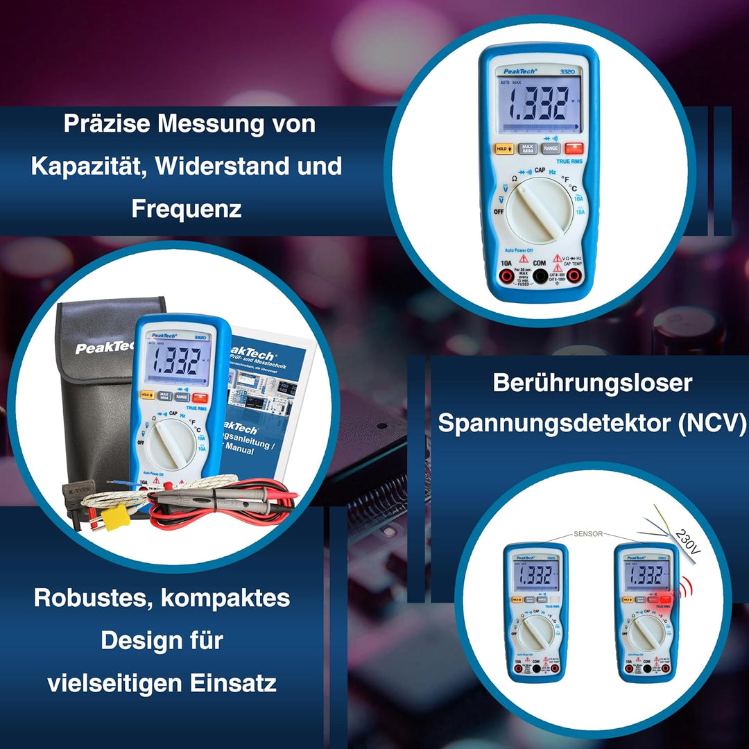 - VIBRIERENDES MESSGERÄT: Das NVC-Multimeter P 3320 von PeakTech entspricht höchsten Sicherheitsstandards, denn neben einem integrierten Schutzrahmen warnt ein Vibrationsalarm vor Übertreten der Alarmschwelle