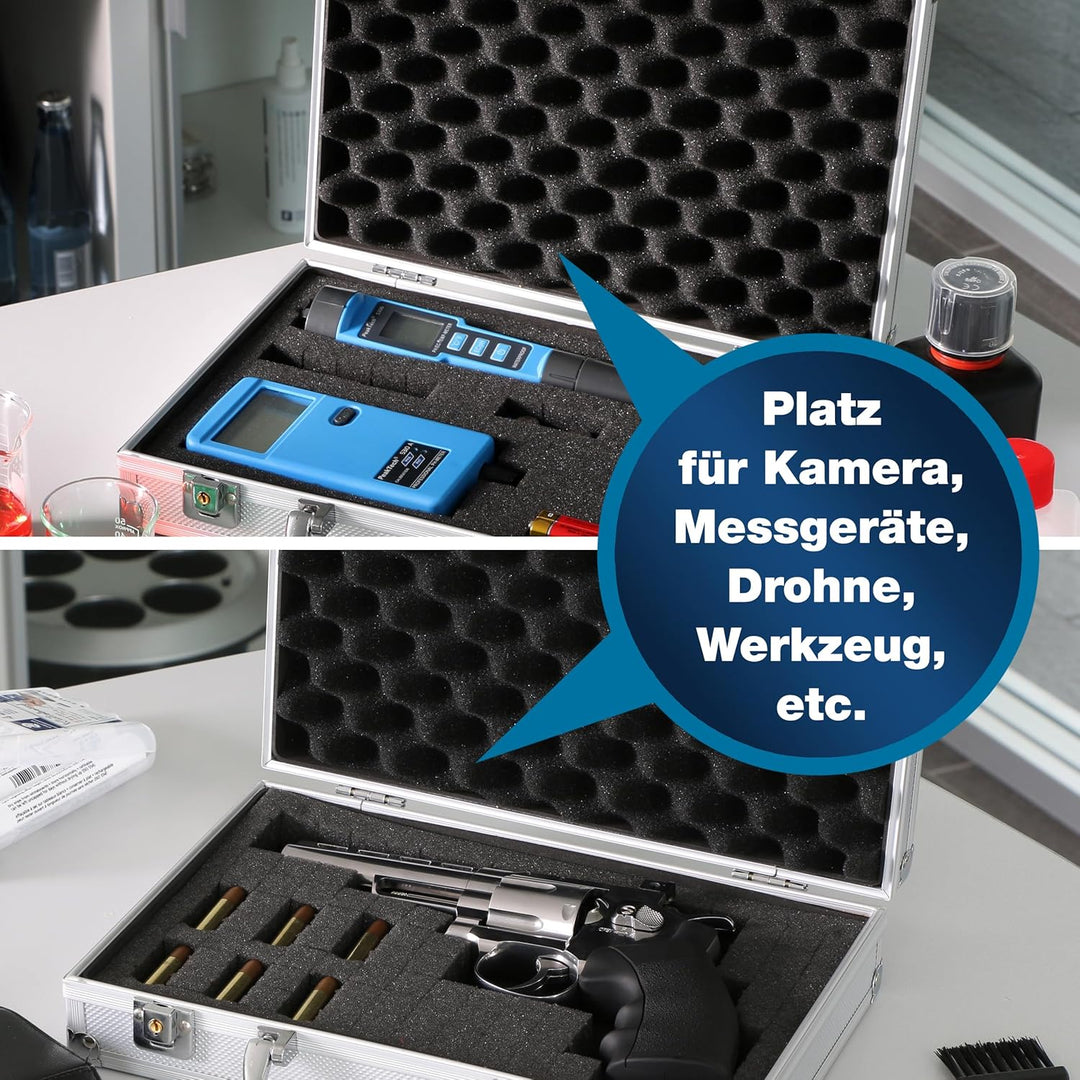 - BESONDERER SCHUTZ: Jeder Koffer ist sowohl mit einer schmalen Schaumstoff- sowie mit einer dickeren, herausnehmbaren Würfelschaumstoffeinlage gepolstert, die Arbeitsgeräte vor Erschütterungen schützt