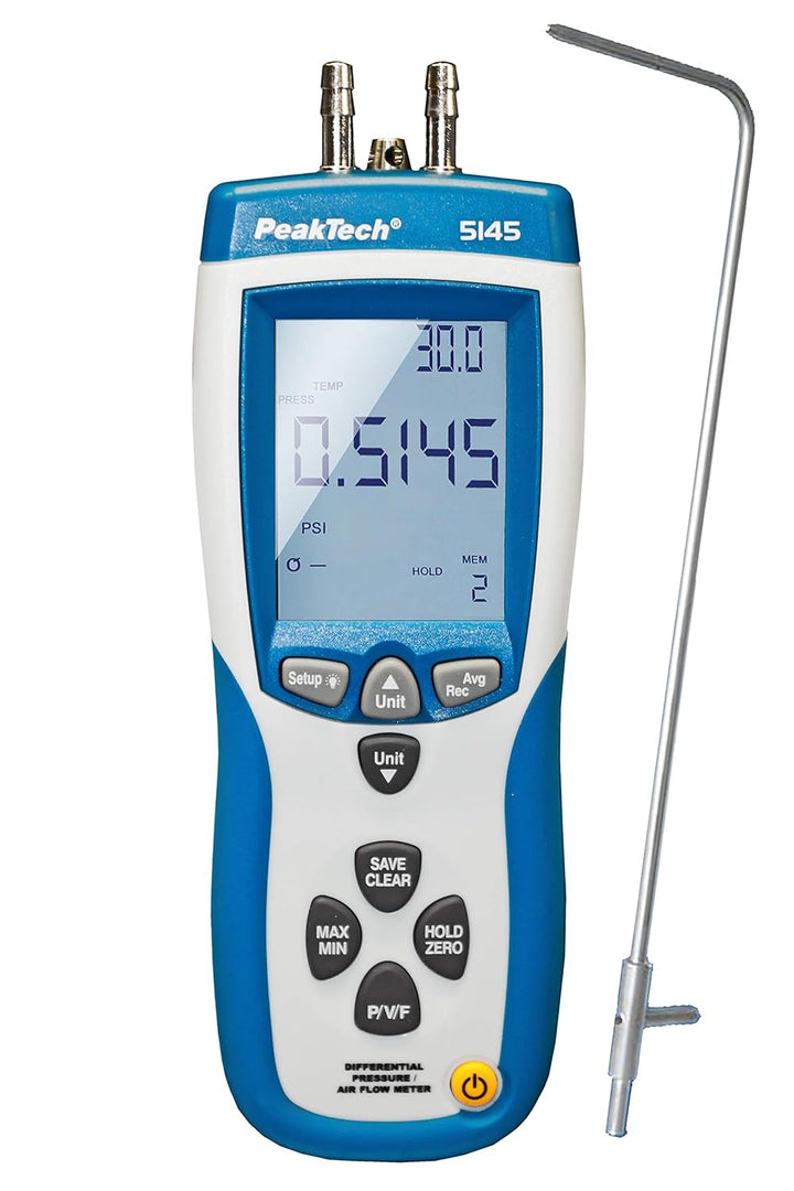 - Messeinheiten: PSI, mBar, inH2O, mmH2O, PA, CFM, CMM, m/s, ft/min, km/h, Mph, Knoten, °C, °F