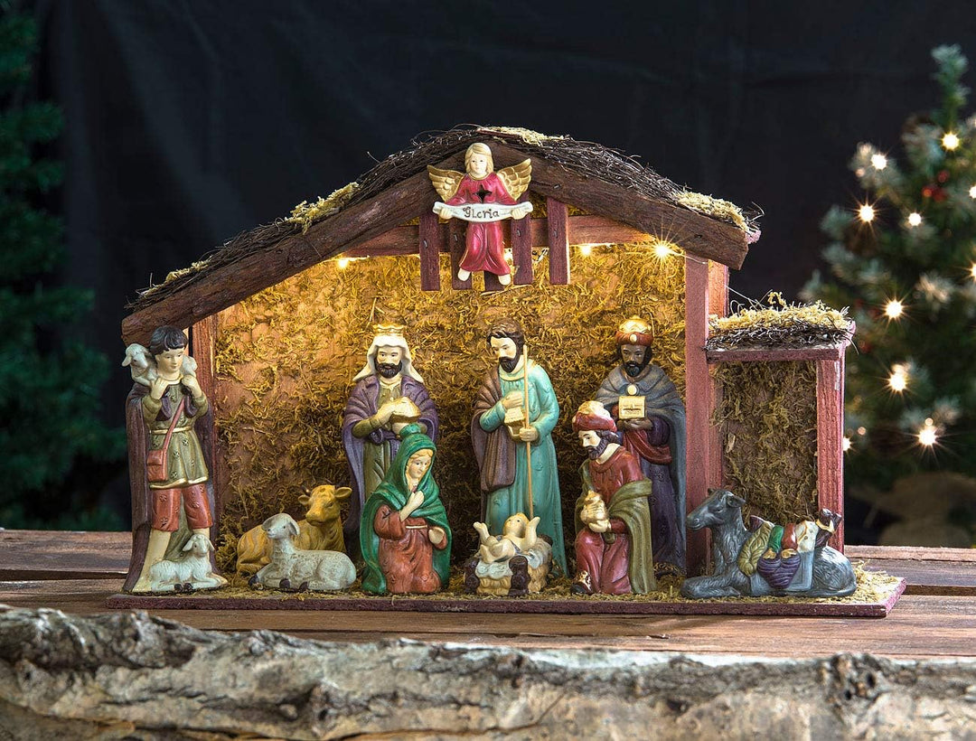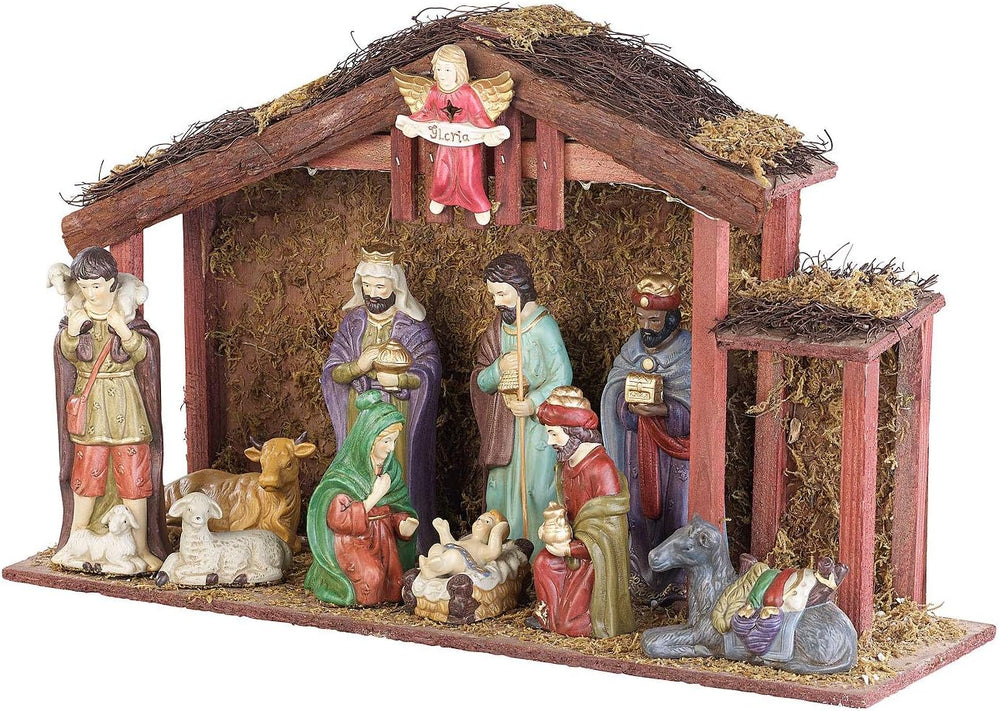- 11 handbemalte Porzellan-Figuren: Jesus-Kind, Engel, Maria, Josef, Caspar, Melchior, Balthasar, Esel, Ochse, Hirte und Schaf • Dauerbetrieb per Ein/Aus-Schalter