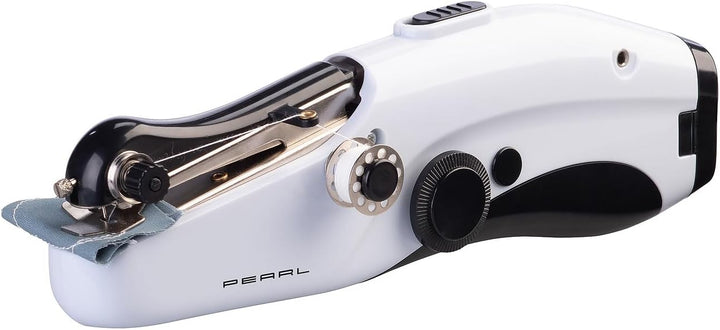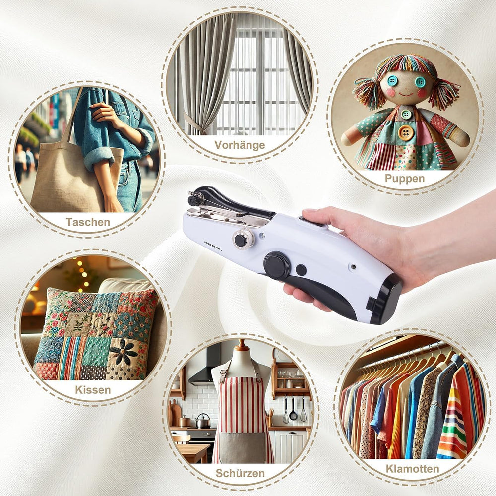 - Einstellbare Fadenspannung für optimale Nähergebnisse • Farbe: weiss • Mini-USB-Handnähmaschine inklusive USB-Kabel, Verlängerungsspindel, Nadel-Einfädler, Ersatznadel, 3 Garn-Spulen und deutscher Anleitung