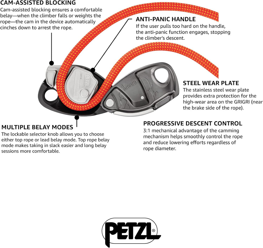 PRODUKTBESCHREIBUNGEN Belay device with assisted braking and anti-panic handle, for all single rope diameters. GRIGRI + is an assisted braking device designed for all climbers, for both indoor and outdoor climbing. It can be used with all single ropes (optimized for 8.9 to 10.5 mm diameter ropes) and is suited for intensive use. The reduction handle offers exceptional descent control. Two usage modes to choose from, depending on need: top-rope belay or lead belay. The top-rope belay mode and the anti-panic handle make for a more comfortable belay, making the GRIGRI + particularly suitable for learning. Belay device with assisted braking for indoors and outdoors, designed for all climbers: - hand motions are the same as with classic belay systems: both hands on the rope. A fall is stopped by tightening the hand on the free end of the rope - can be used with all single ropes, and optimized for 8.9 to 10.5 mm diameters - diagrams for rope installation engraved on belay device (interior and exterior) - great durability, for intensive use, thanks to the stainless steel wear plate Exceptional comfort during the descent, thanks to the very controlled progression of the rope feed Particularly suitable for learning: - anti-panic handle: if the user pulls too hard on the handle, the anti-panic function brakes and stops the descent - choice of belay mode, top-rope or lead, thanks to the selection knob: top-rope belay mode facilitates taking up slack and makes for a more comfortable belay - option of locking the belay mode