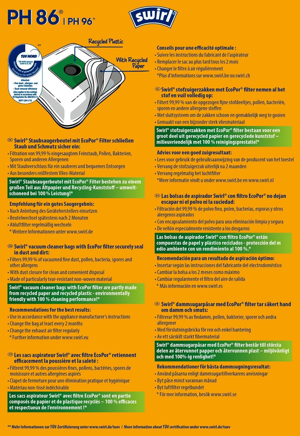 - Lieferumfang: 10 SwirlPH86/PH96 MicroPor Plus Staubsaugerbeutel mit Anti-Allergen-Filter + 2 Filter