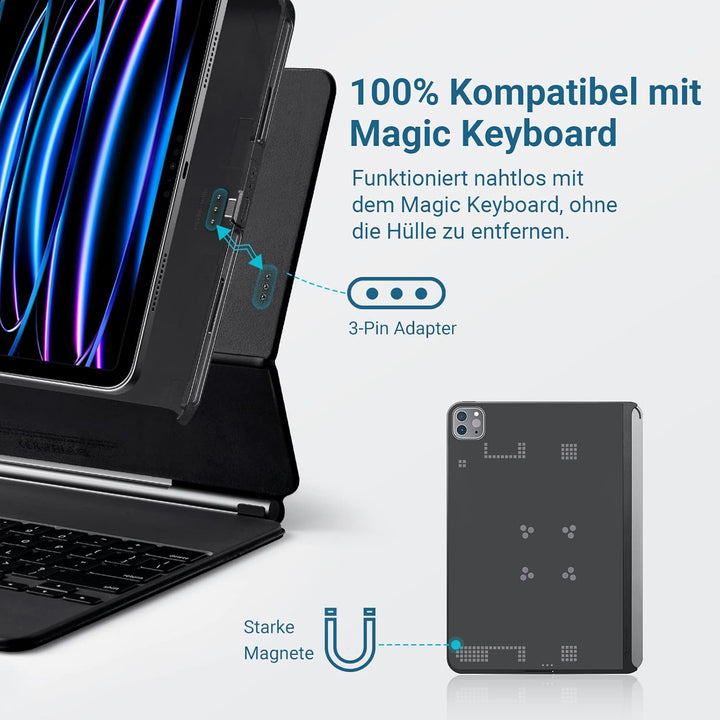 - Dreiseitiges Design mit Abgedecktem Type C: Das dreiseitige Design bietet alltagstauglichen Schutz für die Rückseite und die Seiten und ermöglicht gleichzeitig die nahtlose Integration von iPad Pro und Magic Keyboard. Der Typ-C Anschluss ist für das