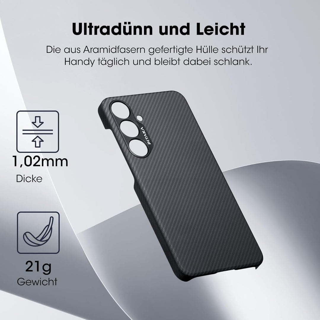 - Aus Aramidfasern in Luftfahrtqualität: Die Hülle besteht aus 100% gewebten Aramidfasern in Luftfahrtqualität und bietet Ihnen ein leichtes und dünnes Tragegefühl, während Ihr Handy vor Abnutzung geschützt wird.