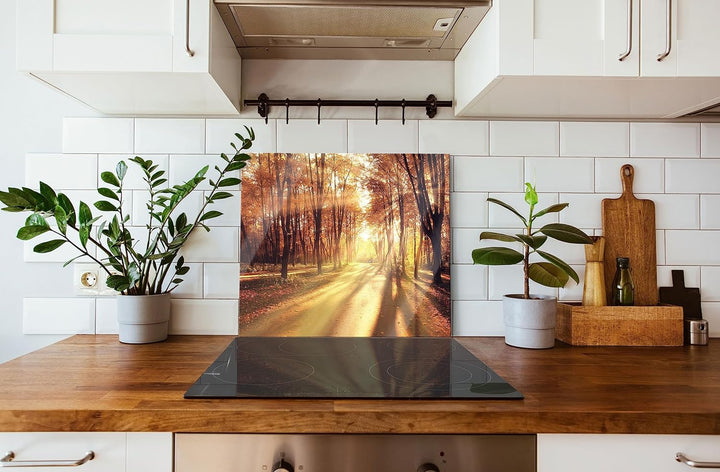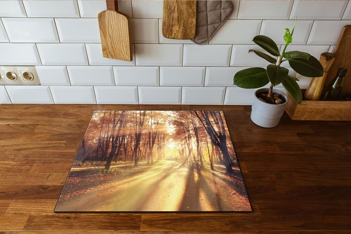 Baumallee im Herbst Herdabdeckplatte & Spritzschutz aus Echtglas | Für Herd-Kochfelder | 60x52 cm
