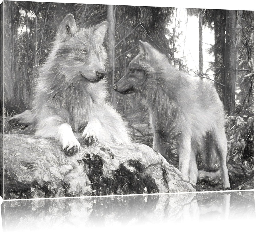 Pixxprint Wölfe im Wald Kunst / 100x70cm Leinwandbild bespannt auf Holzrahmen/Wandbild Kunstdruck De