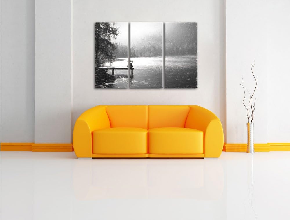 Pixxprint Yoga am See Kunst / 3-Teilig/Gesamtmass 120cm Leinwandbild bespannt auf Holzrahmen/Wandbil