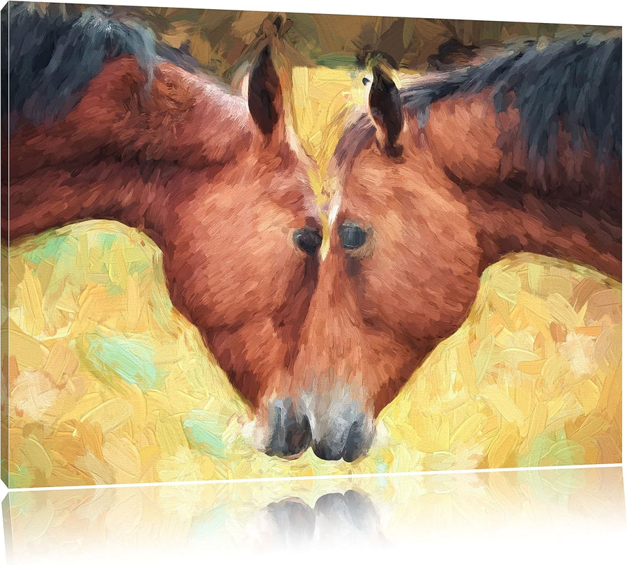 Pixxprint Zwei schmusende Pferde Kunst Pinsel Effekt, Format: 100x70 auf Leinwand, XXL riesige Bilde