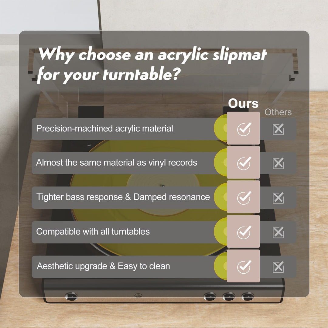 - Perfekte Passform für Vinyl-Plattenspieler-Slipmatte: Diese Acryl-Plattenspieler-Slipmatte kann nach Produkttests und tatsächlicher Verwendung durch Benutzer eine straffere und vollere Basswiedergabe bieten und Ihr Vinyl-Hörerlebnis durch Verbesserung
