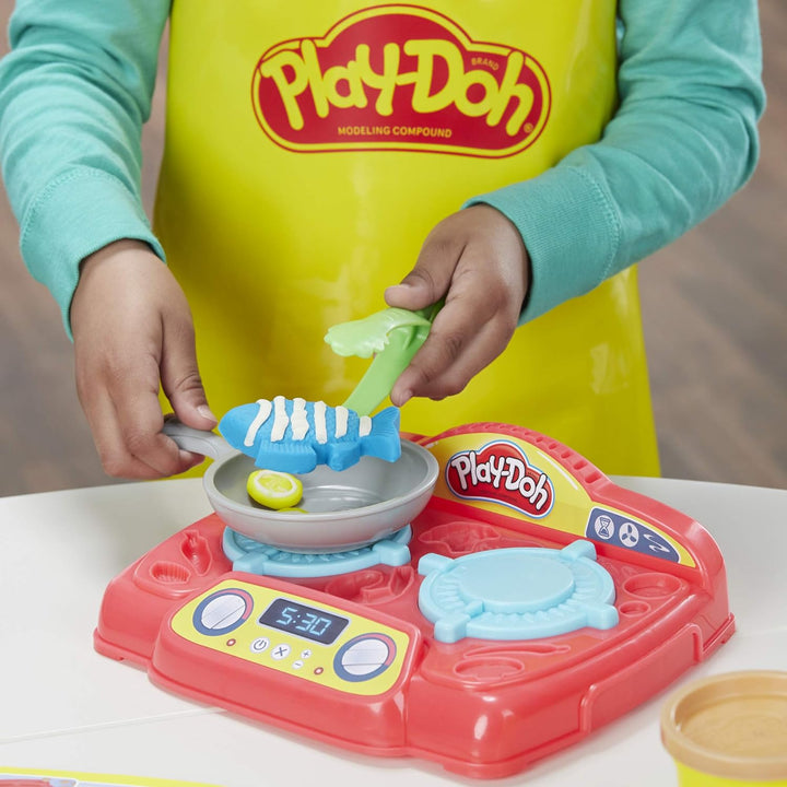 - Herdplatte mit Geräuschen - Die batteriebetriebene Herdplatte erzeugt tolle Brutzelgeräusche, wenn ein Play-Doh Knetgut in die Pfanne oder den Kochtopf gelegt wird