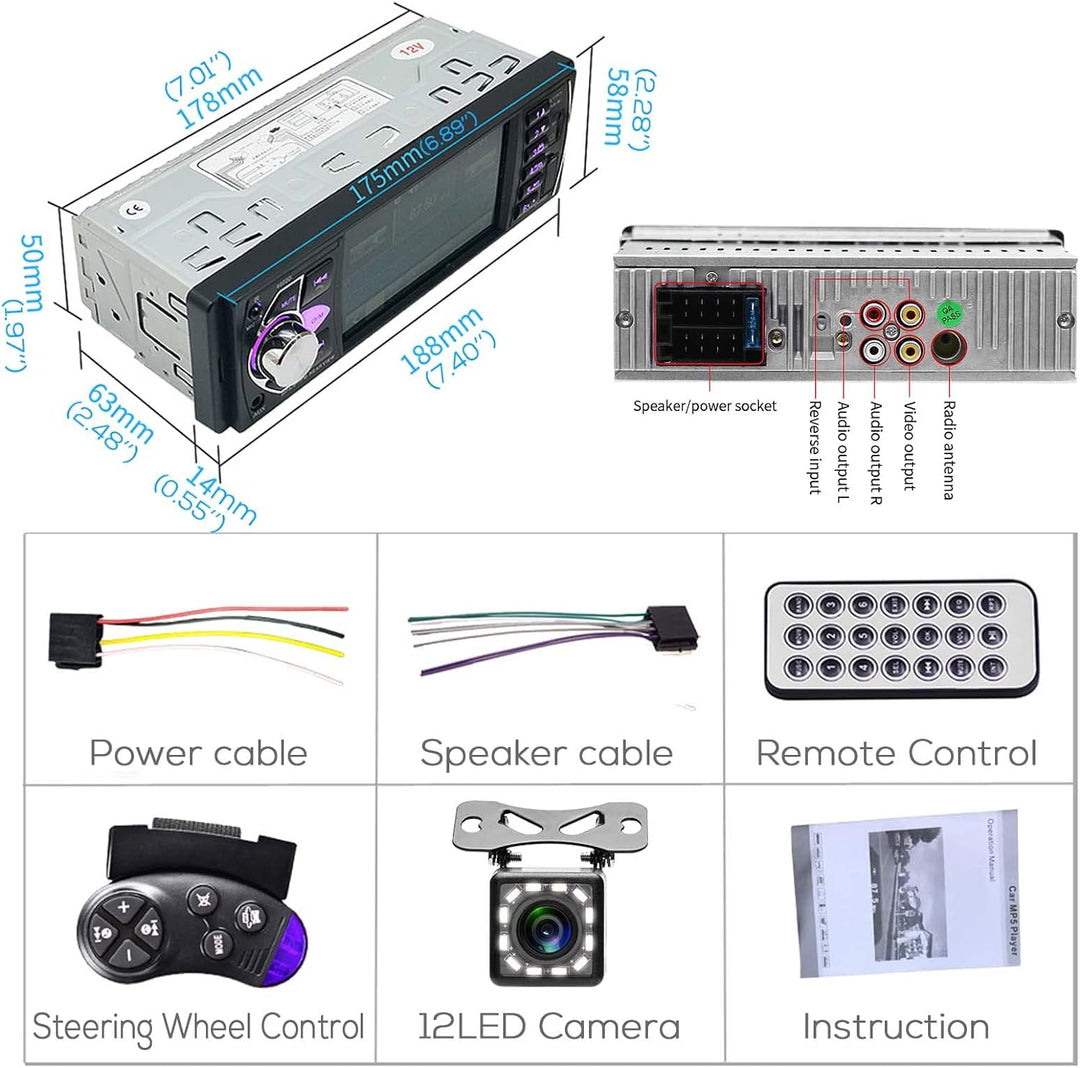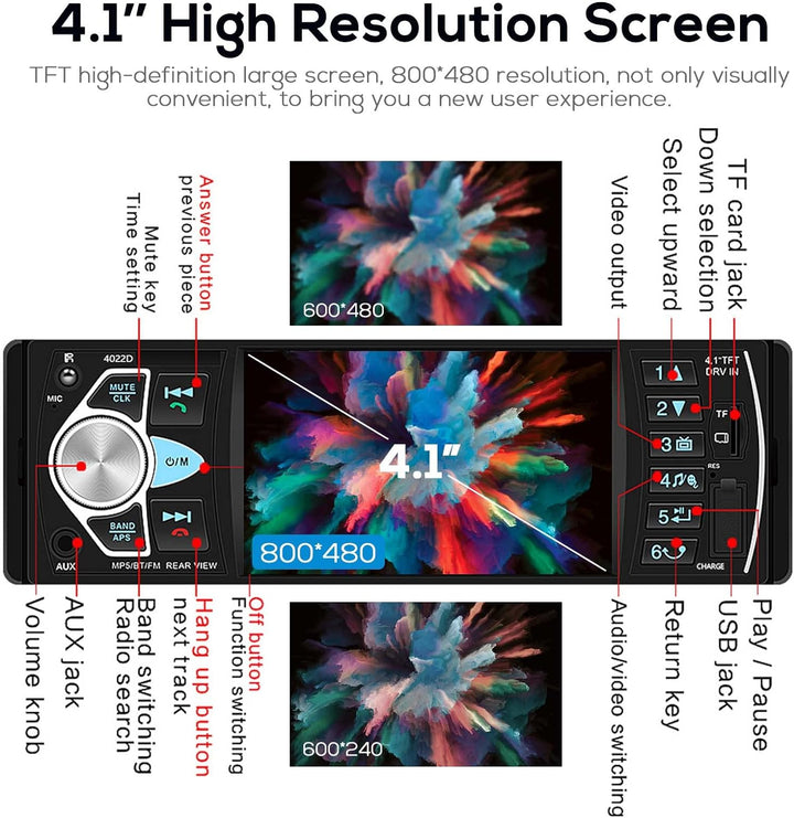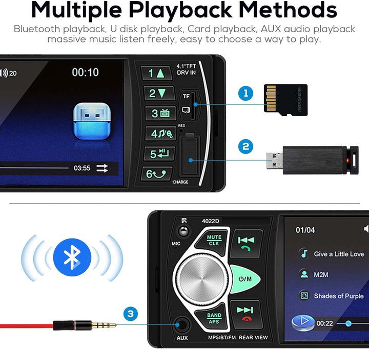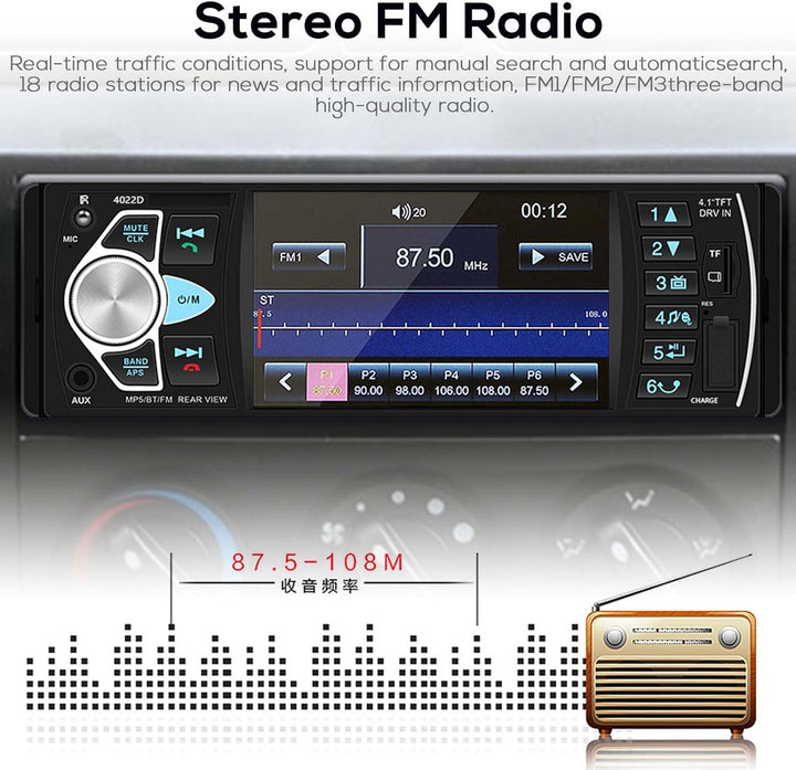 • 【 FM Radio 】Eingebautes FM-Radio mit 18 voreingestellten Sendern 87,5 ~ 108 MHz, Online-Musik Sie können die Musik per FM auf die Autoradio übertragen, um den ursprünglichen Autoradio-Sound zu geniessen. 4,1 "HD-Digitalbildschirm, unterstützt RM, RMVB, AVI, MP4, MKV und bietet Ihnen eine hervorragende Erfahrung.
