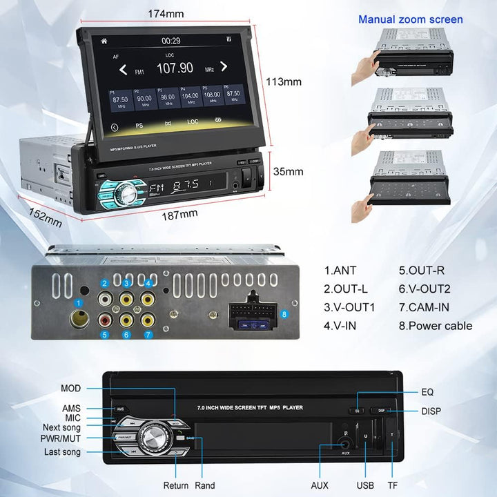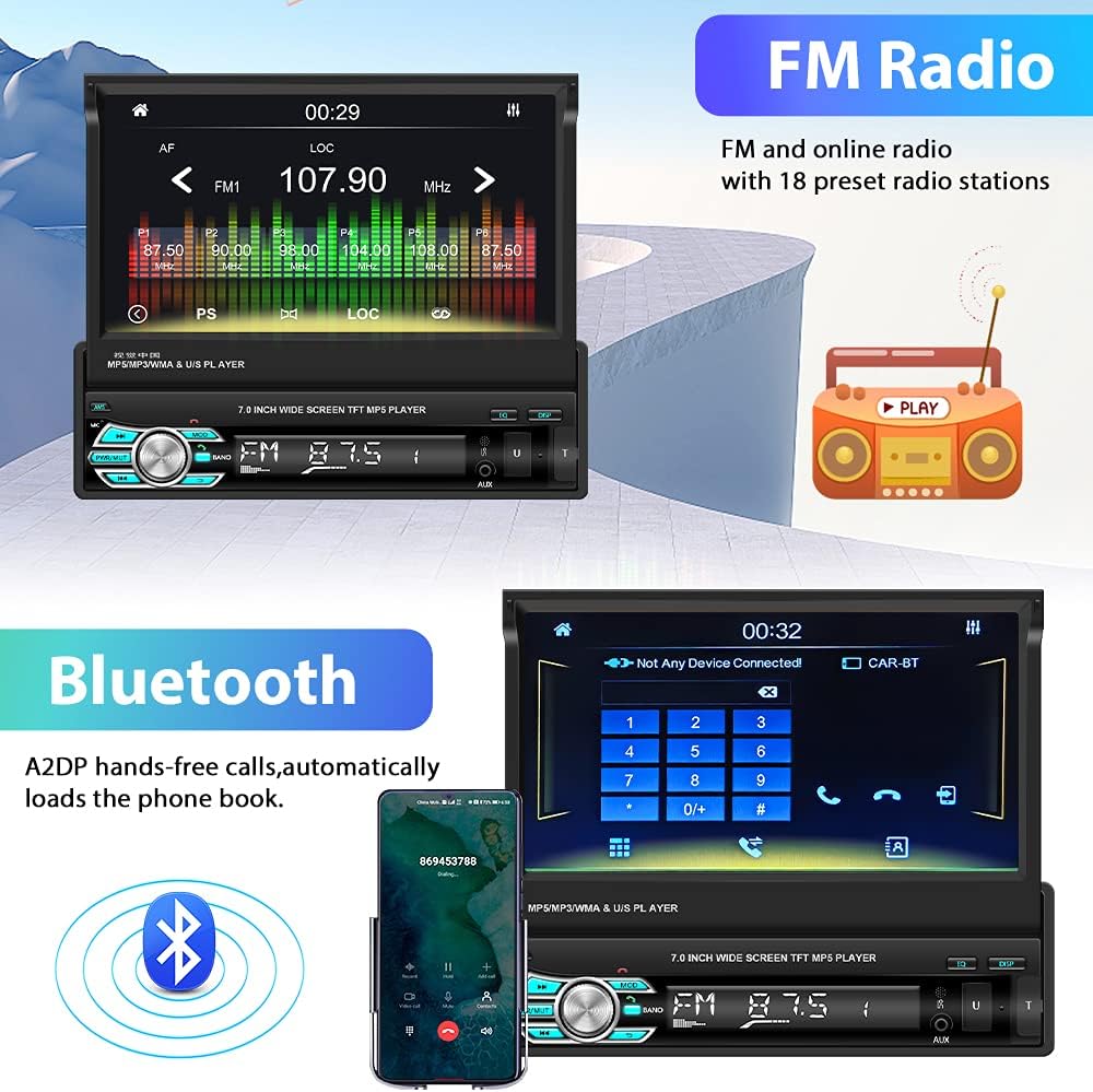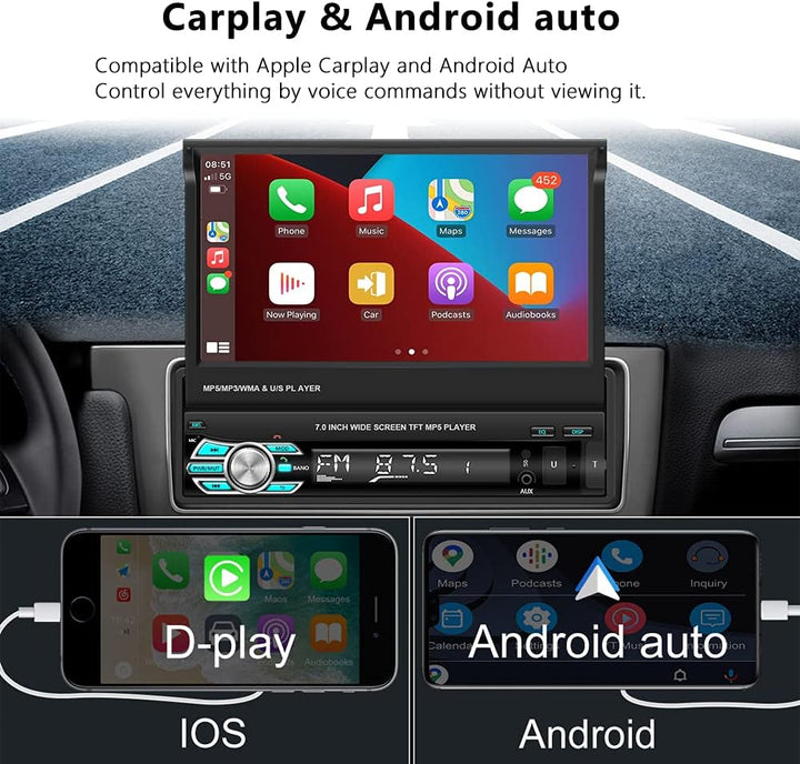 - 🚗【Einziehbarer Klappbildschirm】- Der Autoplayer befestigt ein einziehbares 7-Zoll-HD-Bildschirmpanel an der gewöhnlichen Einzeldin. Es kann in zwei Modi geändert werden. Wenn Sie einen grossen Bildschirm benötigen, geniessen Sie die Vision des grossen Bildschirms (Sie müssen sie manuell umschalten).