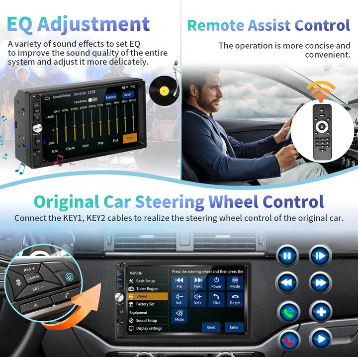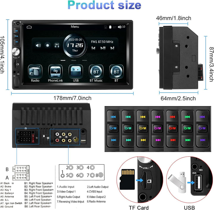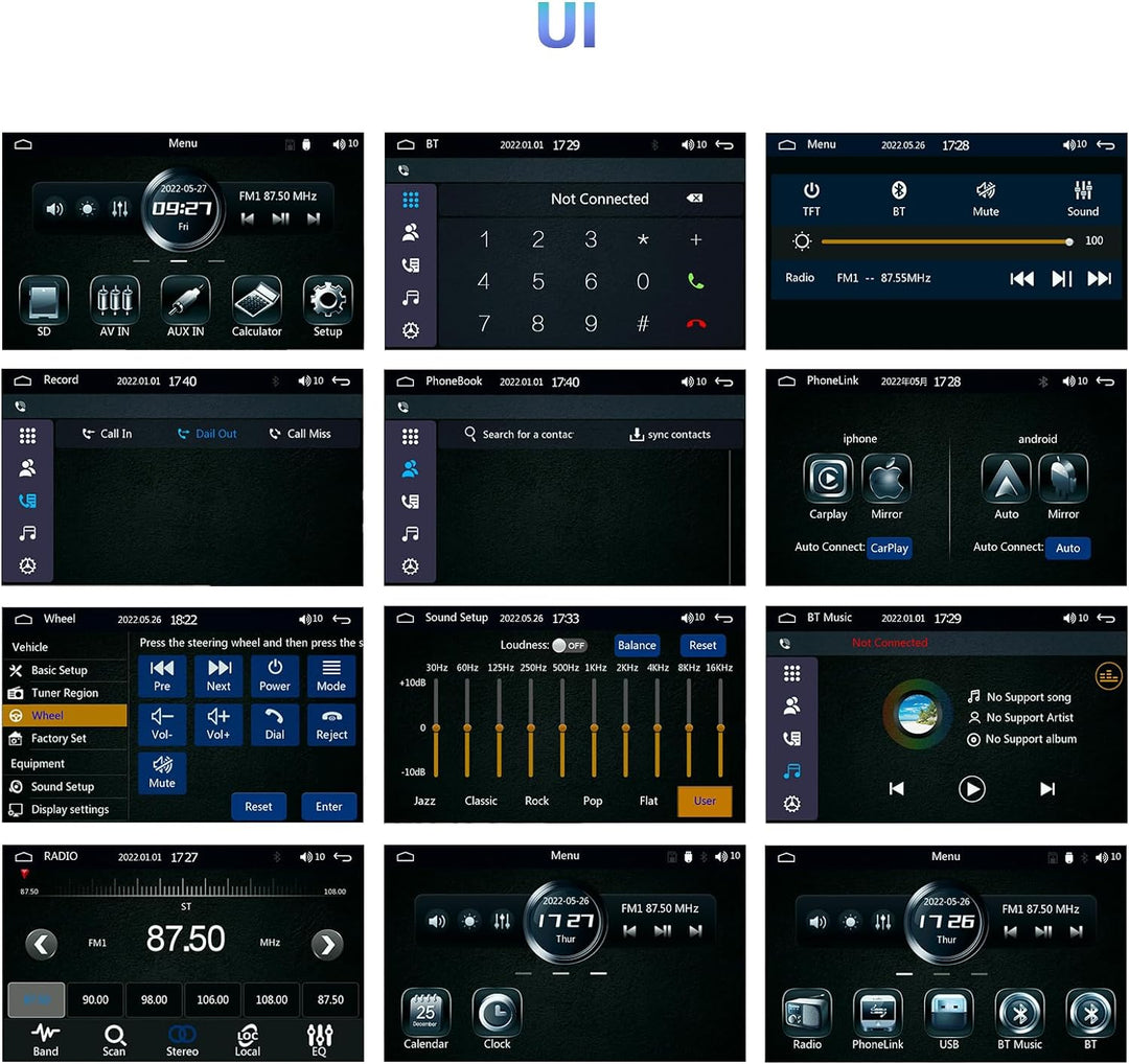- 🚗【Weitere Funktionen】- Unterstützt SD-Karte, USB-Wiedergabe, AUX-Musikwiedergabe, Sprachumschaltung, dualer USB2.0-Adaptereingang, RCA-Audio- und Videowiedergabe, Zeiteinstellung, Schnittstellenthemen, Hintergrundbildumschaltung usw.