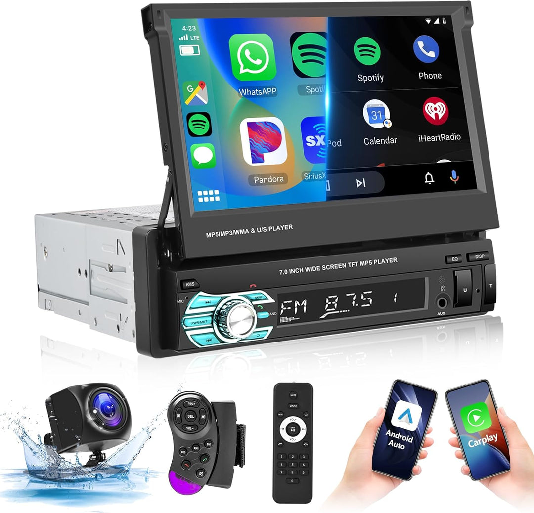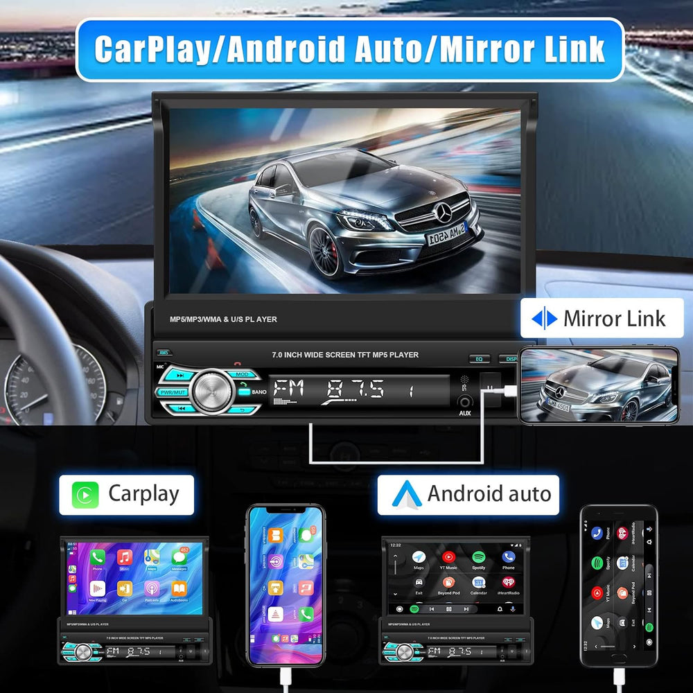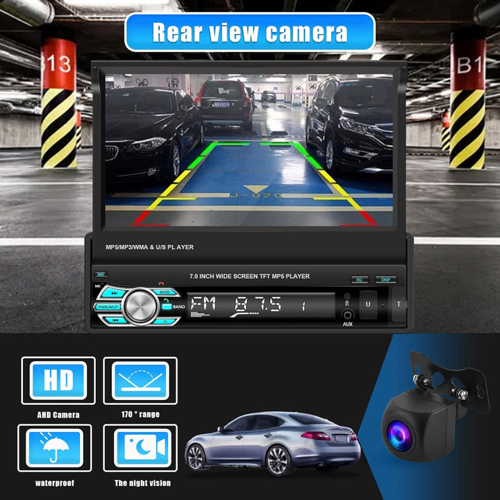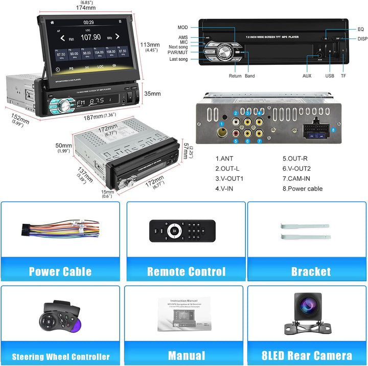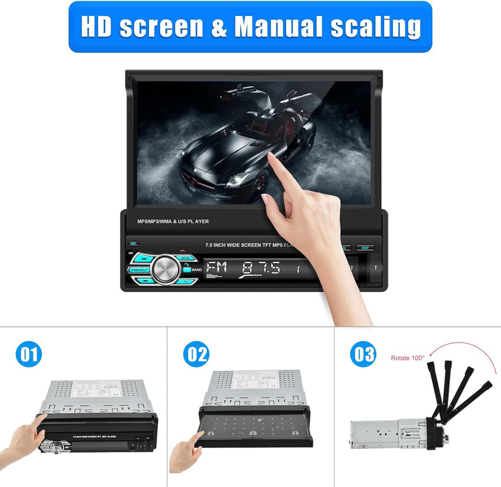 - 【1din Autoradio】 7.4 Zoll (188 mm), die Höhe beträgt 2.3 Zoll (58 mm), die Tiefe beträgt 5.4 Zoll (152 mm). Hochwertiger 7 Zoll manueller ausklappbarer Touchscreen, Es kommt mit einem Kabelbaum mit blanken Drähten, ohne ein Anschluss.Unser Dashboard ist mit einem 7 Zoll High Definition-kapazitiven Touchscreen ausgestattet, die Berührung ist empfindlicher und präziser und unterstützt die 1080P-Videowiedergabe.Mit USB, AUX-In, SD-Kartenanschluss.
