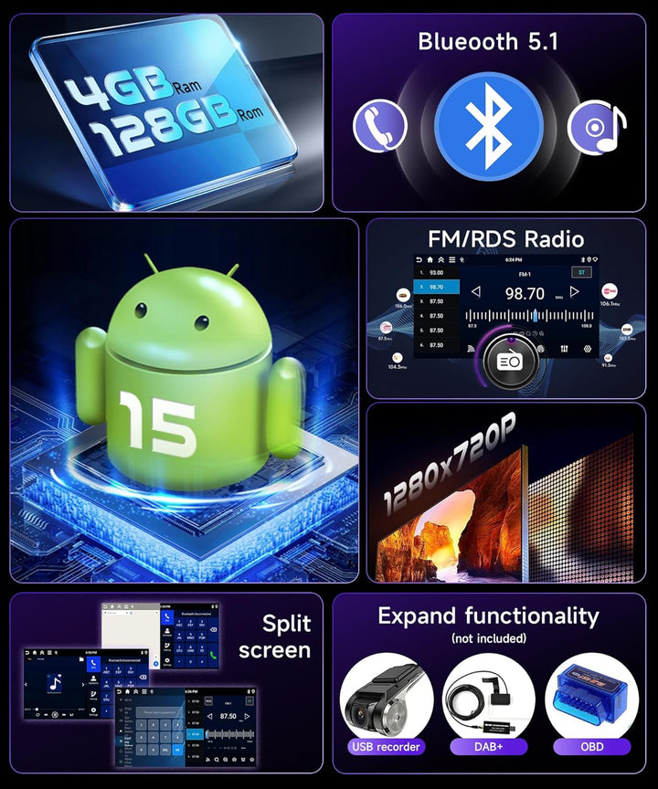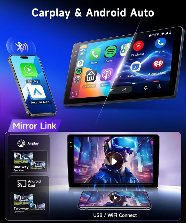 - 【Autoradio Apple Carplay Wireless/Split Screen】Kann drahtloses carplay, drahtlose Android auto Verbindung durchführen, einfach mit bluetooth Ihres Telefons verbinden, kann auch kabelgebundene Verbindung erreicht werden. Unterstützt externes Mikrofon, DAB-Eingang, DVR. Es kann eingestellt werden, um zwei Anwendungen zur gleichen Zeit zu erweitern, zum Beispiel, Karten und Musik können gleichzeitig geöffnet werden. Aber bitte beachten Sie, dass die Video-App keinen geteilten Bildschirm unterstützt.