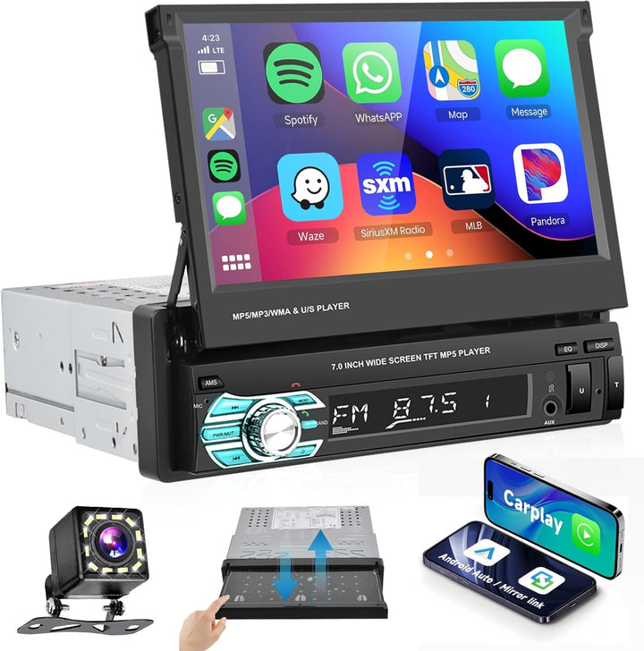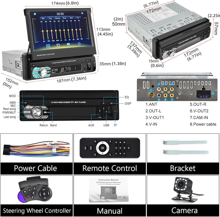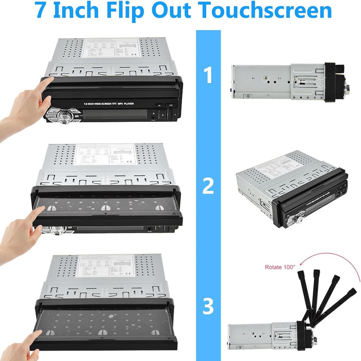 - 【1 Din Autoradio】 7.4 Zoll (188 mm), die Höhe beträgt 2.3 Zoll (58 mm), die Tiefe beträgt 5.4 Zoll (152 mm). Hochwertiger 7 Zoll manueller ausklappbarer Touchscreen, Es kommt mit einem Kabelbaum mit blanken Drähten, ohne ein Anschluss.Unser Dashboard ist mit einem 7 Zoll High Definition-kapazitiven Touchscreen ausgestattet, die Berührung ist empfindlicher und präziser und unterstützt die 1080P-Videowiedergabe.Mit USB, AUX-In, SD-Kartenanschluss.
