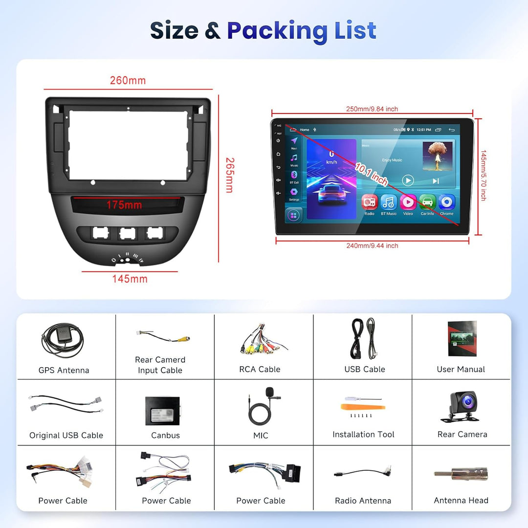 • ►【Autoradio Spezialisiert für Peugeot/Citroen/Toyota】Für Peugeot 107/Citroen C1/Toyota Aygo, 10.1-Zoll Touchscreen Autoradio mit Android System, 2G Ram, 64G Rom, Quad-core. Dimension: 260(obere Breite) x 145(untere Breite) x 265(Höhe) mm.