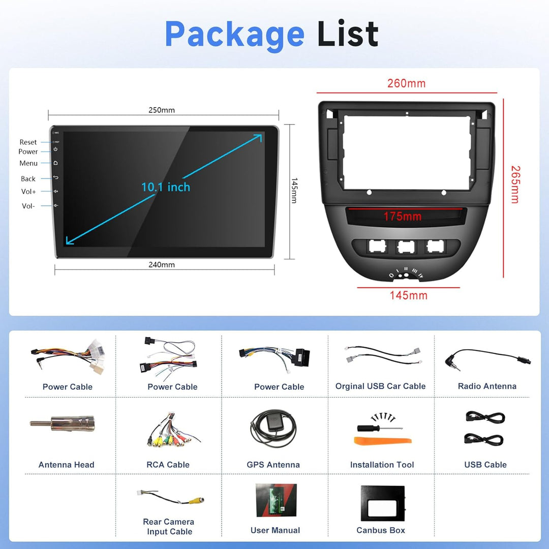 • 【Autoradio mit grossem Bildschirm, speziell für Toyota Aygo/Peugeot 107/Citroen C1(2005-2014)】⚠HINWEIS: Passen Sie NUR auf die gleiche Mittelkonsolenform wie auf dem Bild. Abmessungen: 260 (Breite oben) x 145(Breite unten) x 265 (Höhe) mm.