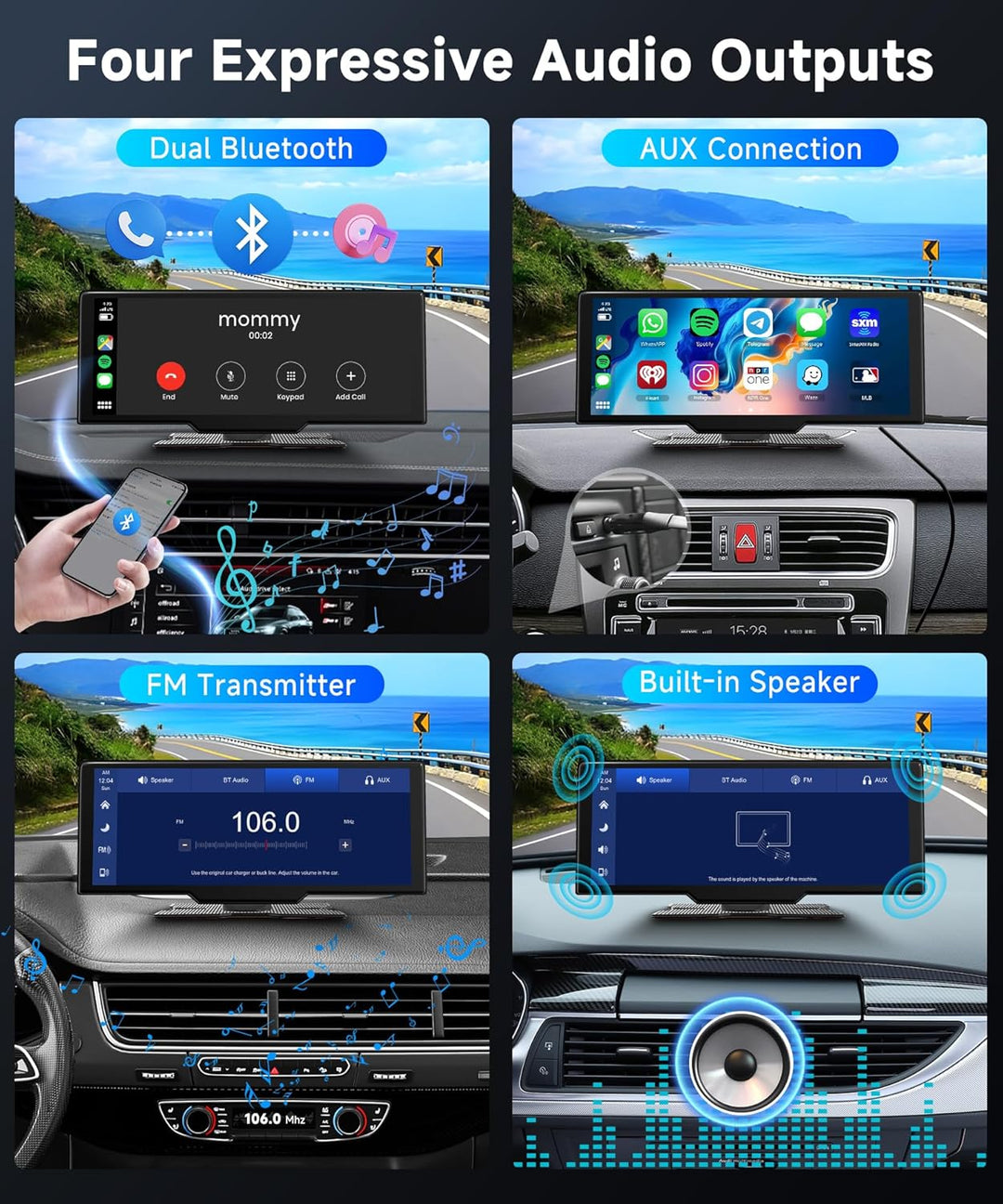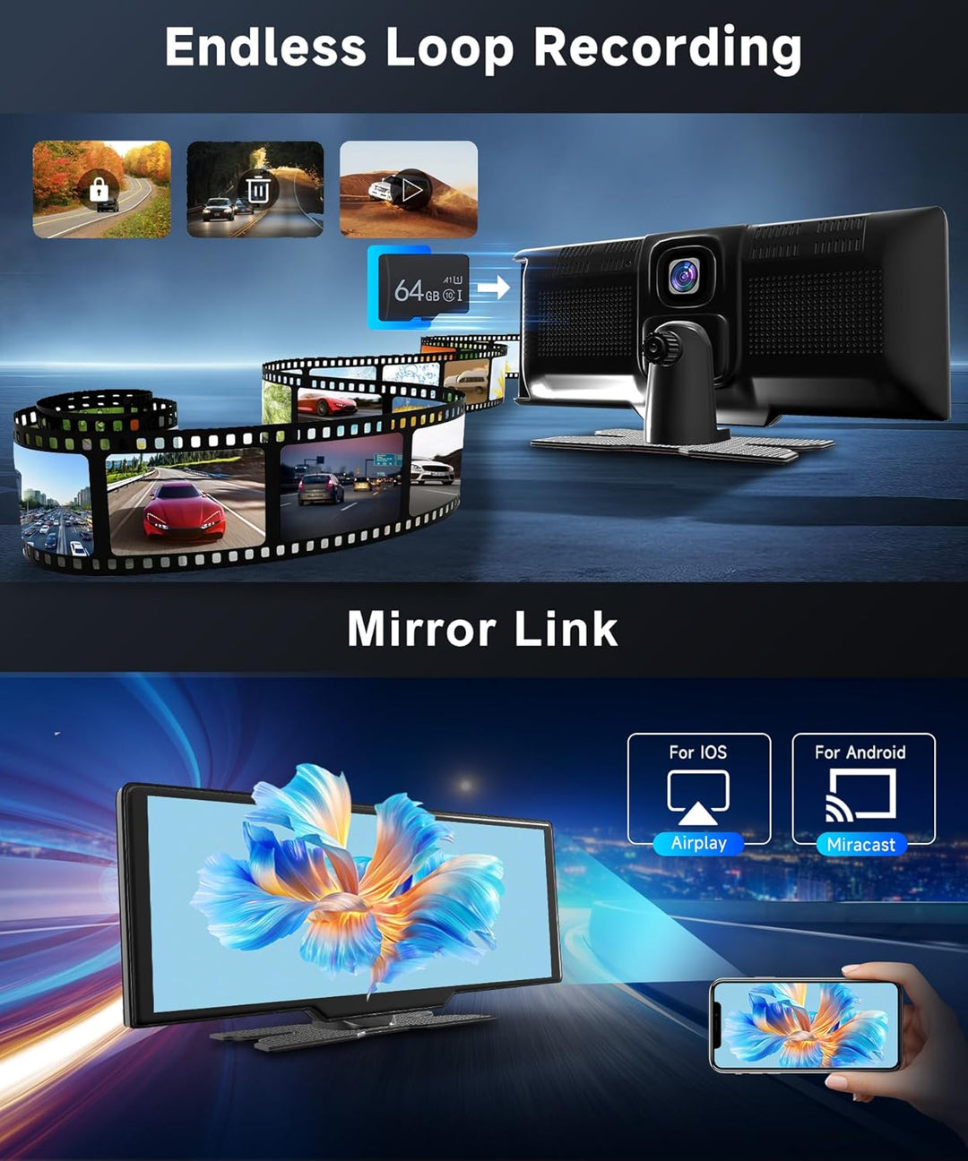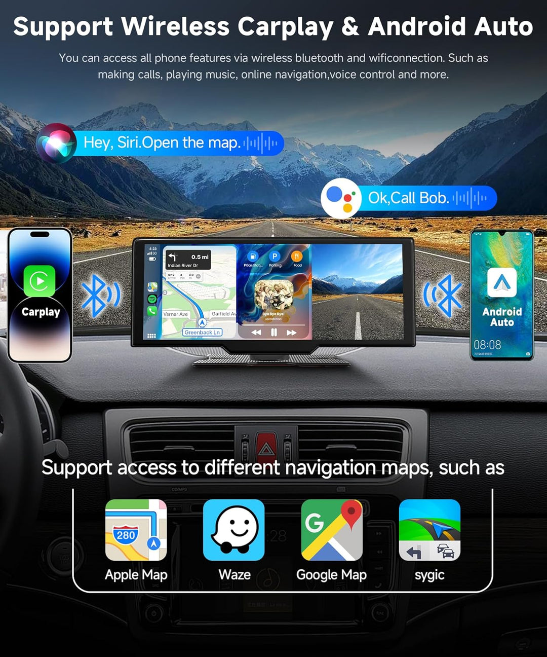 - 🚗【Bluetooth & Maps Navigation】Unsere dash cam eingebauten Bluetooth, können Sie drahtlose Musik hören, empfangen und machen Freisprechanrufe ohne während der Fahrt gestört zu werden. Sie können Karten über Carplay/Android Auto Funktion