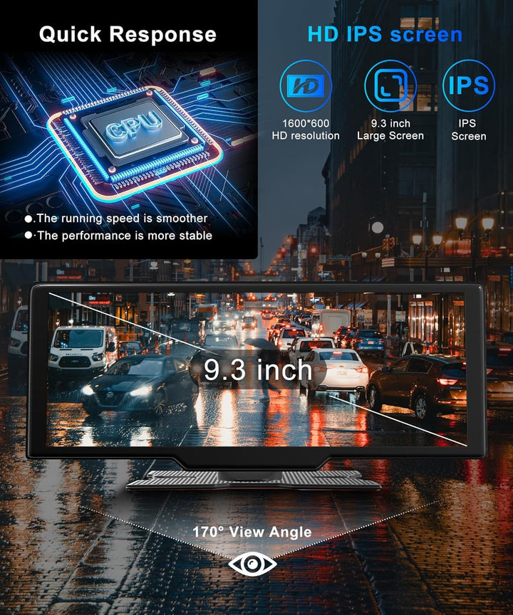 - 🚗【Drei Arten der Audiowiedergabe】Das tragbare 9,3-Zoll-Autoradio verfügt über eingebaute Lautsprecher, aber für einen lauteren Klang können Sie den Ton an die Autolautsprecher übertragen, entweder über einen FM-Transmitter, der auf dieselbe
