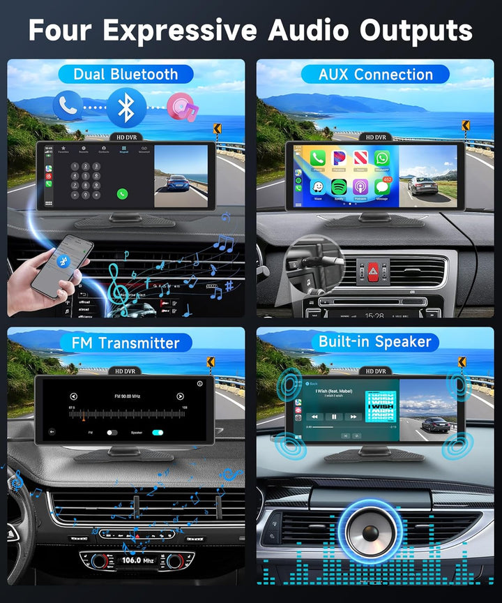- 【FM Transmitter/Split Screen】FM Transmittier: Stellen Sie das Original-Autoradio und das Autoradio auf denselben FM-Kanal ein, und FM wird über den Original-Autolautsprecher abgespielt. Unterstützt geteilten Bildschirm für Startbildschirm und