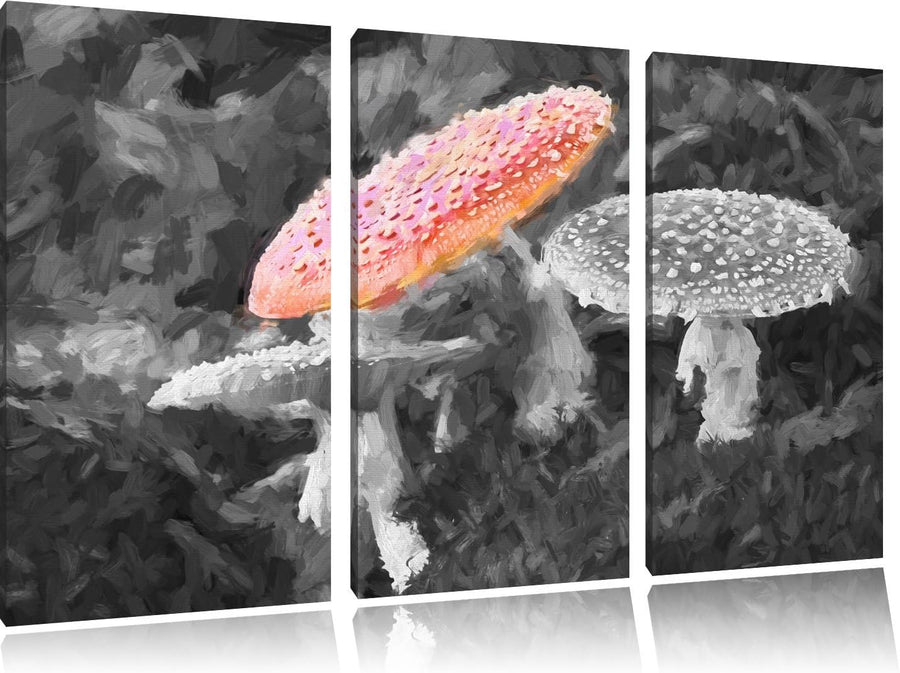 prächtige Fliegenpilze auf Waldboden schwarz/weiss Spezial 3-Teiler Leinwandbild 120x80 Bild auf Lei
