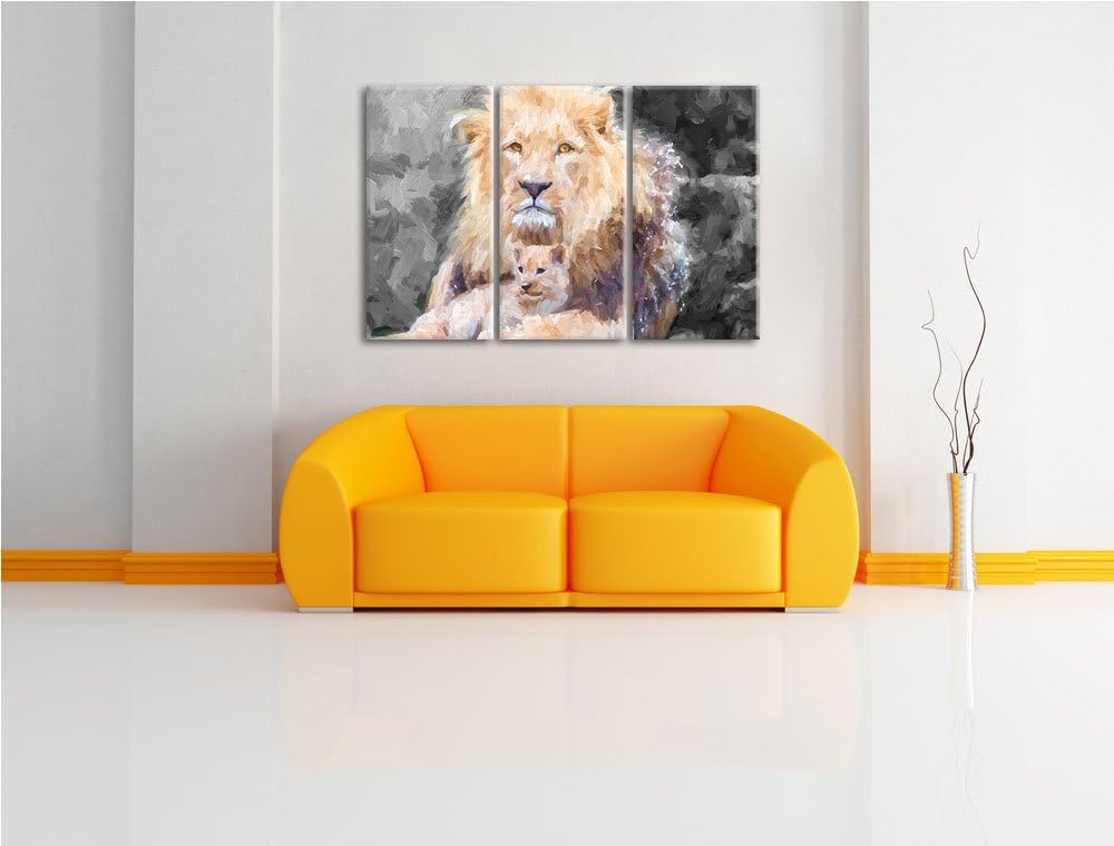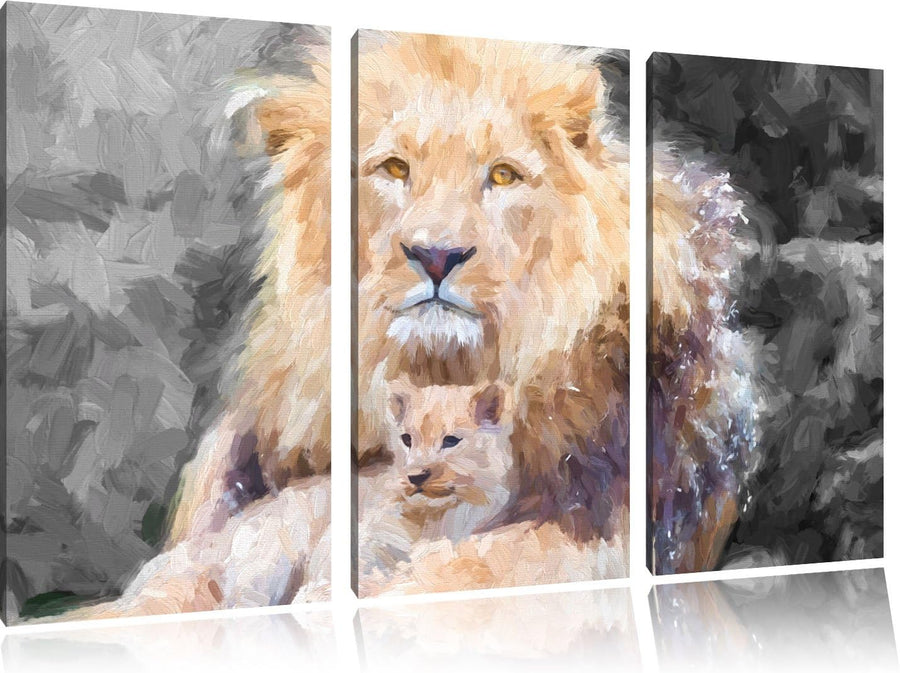 prächtiger Löwe kuschelt mit Jungtier schwarz/weiss Deluxe 3-Teiler Leinwandbild 120x80 Bild auf Lei