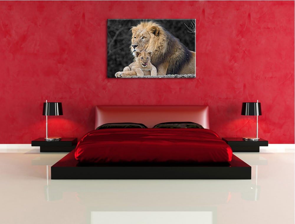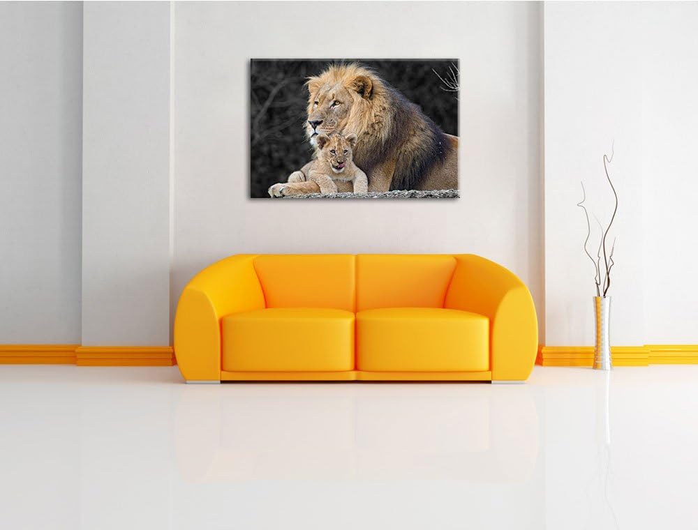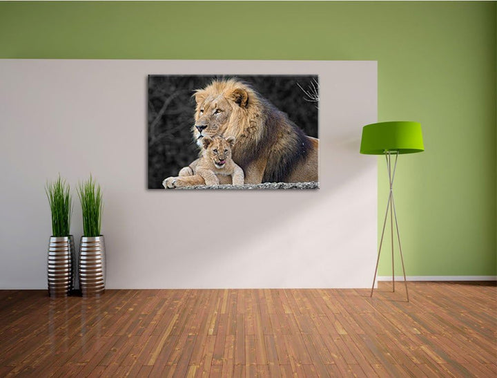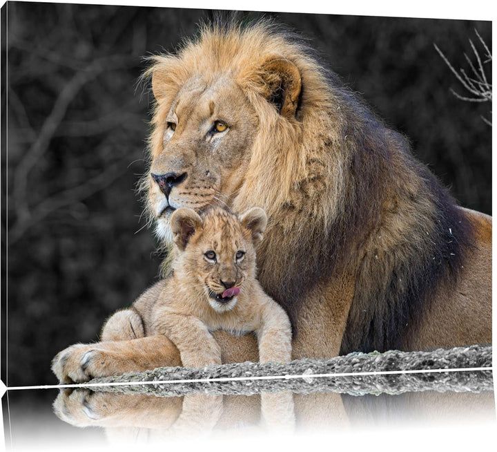 prächtiger Löwe kuschelt mit kleinem Jungtier schwarz/weiss Format: 100x70auf Leinwand, XXL riesige