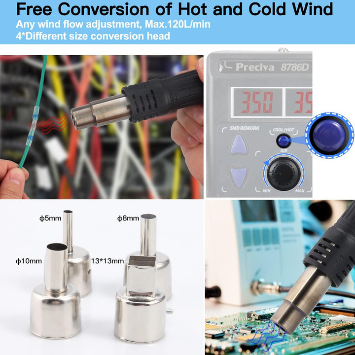 - KEIN WINDSCHUTZ: Wenn die Heissluftpistole abnormal stoppt, schaltet sich das Programm automatisch einen Alarm ein und stoppt die Stromversorgung des Heizkerns, um die Sicherheit zu gewährleisten.