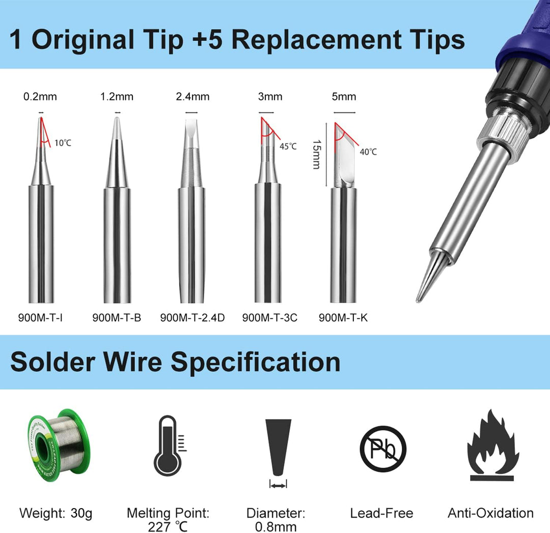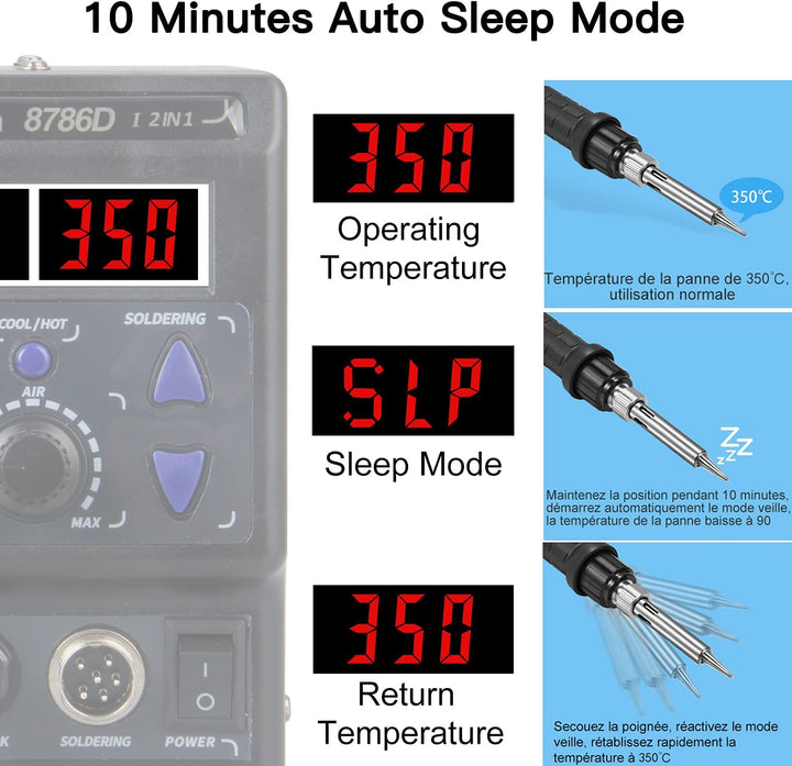 - Schlaffunktion: Nach 10 Minuten Inaktivität schaltet der Lötkolben automatisch in den Ruhestand und die Temperatur des Lötkolbens sinkt automatisch auf 200 ℃, wodurch die der gefährdeten Teile (wie Lötkolben) verlängert wird.
