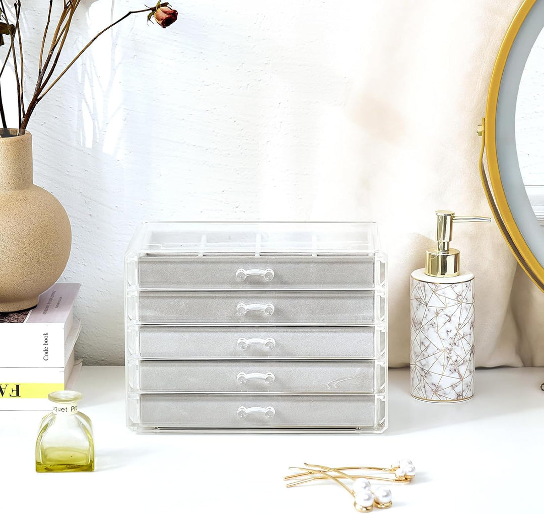 - ✅ 5 herausnehmbare Fächer aus Samt - 5 Schubladen lassen sich mit leicht zu greifenden Griffen herausziehen. Die Samtfächer auf jeder Ebene können von den Schubladen abgetrennt und zum Organisieren anderer grösserer Gegenstände verwendet werden