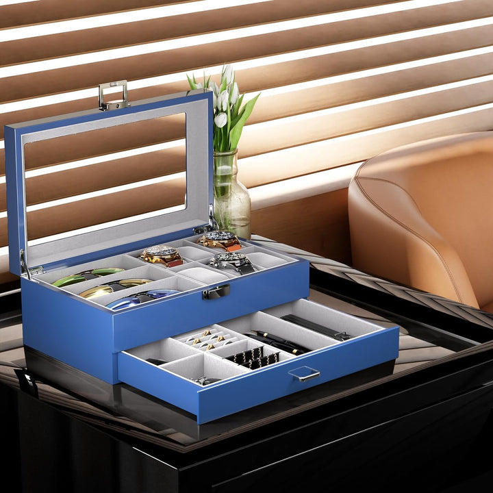 - ⌚ [Zweistöckiges Design] 6 Fächer für Uhren und 3 Positionen für Brillen auf der obersten Ebene; Jedes Uhrenfach (8,9 x 5 x 5 cm) hat ein herausnehmbares Kissen, das eine kleine oder grosse Uhr