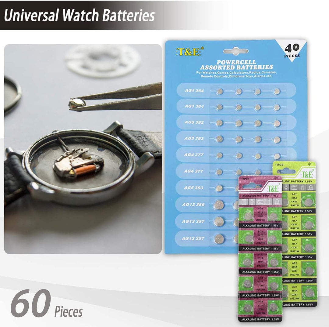 - 【60 Stück Universal-Uhrenbatterien】8 Stück AG1/LR621/364, 8 Stück AG3/LR41/392, 8 Stück AG4/LR626/377, 4 Stück AG5/LR754/393, 4 Stück AG12/LR43/386, 8 Stück AG13/LR44 Stück 4/357 , 10 Stück AG6/LR920/371, 10 Stück AG7/LR927/395
