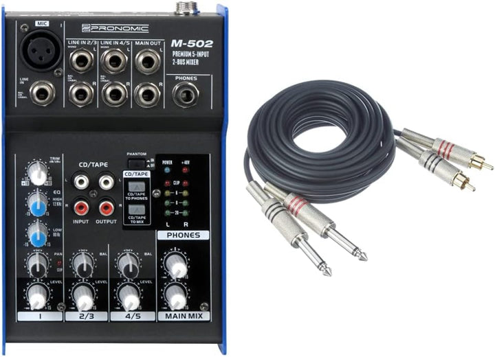- Produkt 1: 5-Kanal Mixer, 1 Mono-Kanal XLR/Klinke-Eingang, 2 Stereo-Kanäle Klinke Trim-Regler im Mono-Kanal