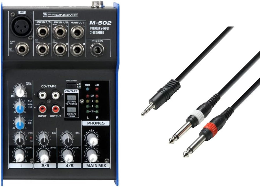 - Produkt 1: 5-Kanal Mixer, 1 Mono-Kanal XLR/Klinke-Eingang, 2 Stereo-Kanäle Klinke Trim-Regler im Mono-Kanal