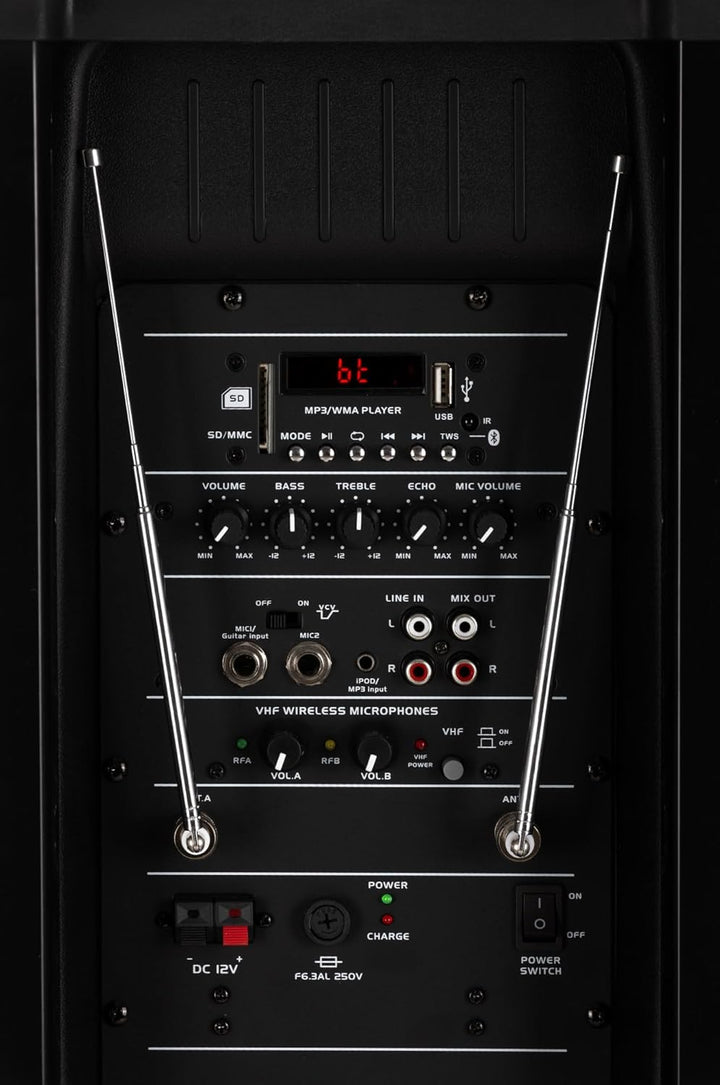 - Bluetooth-Schnittstelle, eingebauter MP3-Player mit USB/SD-Anschluss, Line IN/OUT: Chinch L/R, Eingänge: 1 x Mikrofon/Gitarre 6,35 mm Klinke, 1 x Mikrofon 6,35 mm Klinke, 1 x MP3/Smartphone 3,5 mm AUX Klinke