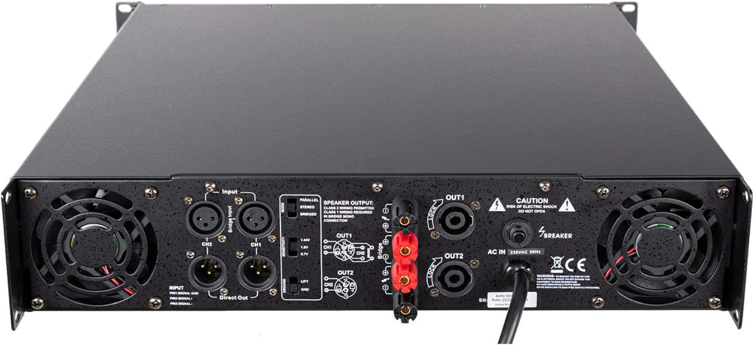 - Ausgangsleistung (8 Ohm gebrückt): 2600 Watt, (4 Ohm gebrückt): 3800 Watt, Schaltungstype: Class H