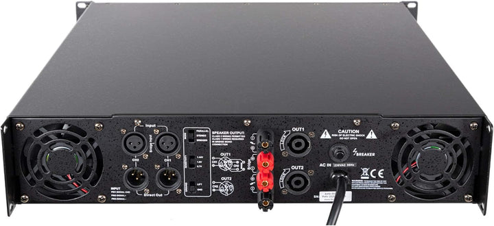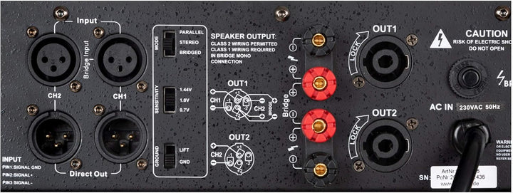- 2 x XLR Direct Cut Eingang + 2 x XLR bridged Eingang, 2 x Speakon-kompatible Ausgänge + je 2 Schraubterminals