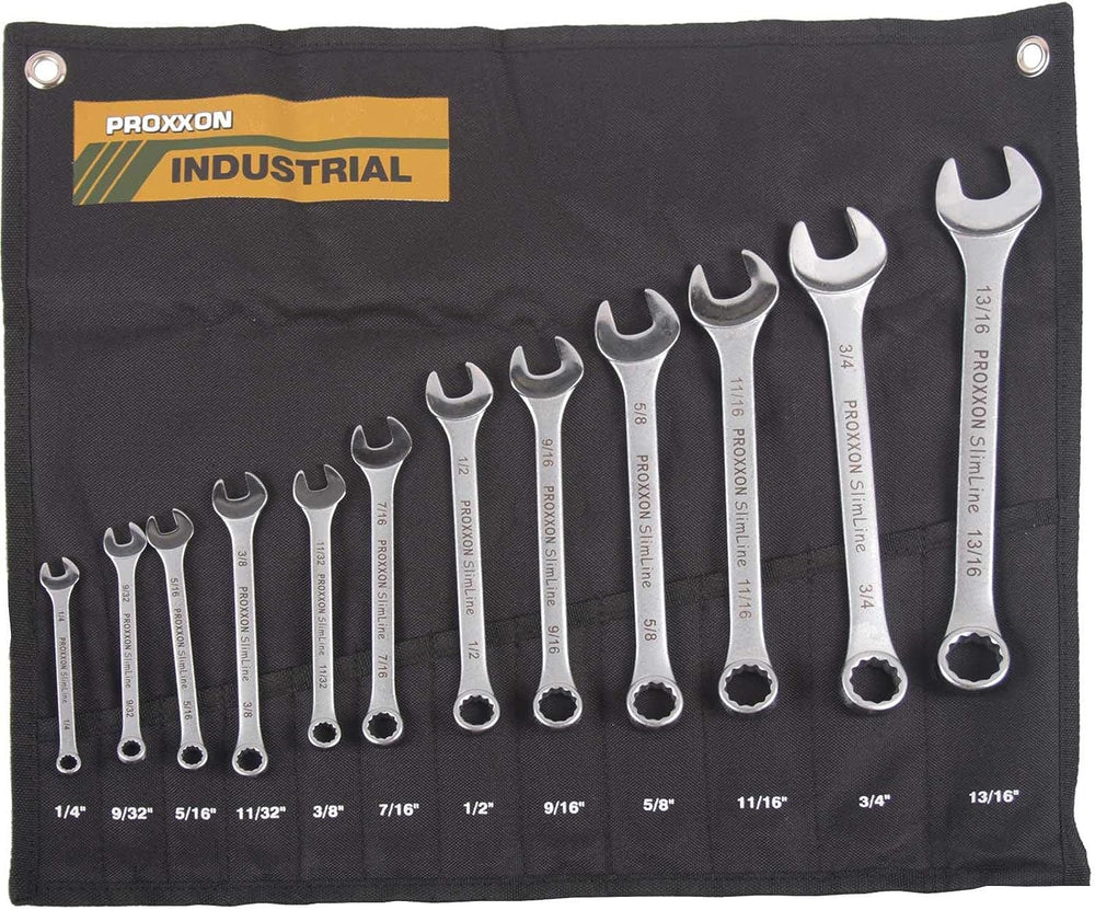 - enthaltene Schlüsselweiten: 1/4" - 9/32" - 5/16" - 11/32" - 3/8" - 7/16" - 1/2" - 9/16" - 5/8" - 11/16" - 3/4" und 13/16" + Rolltasche