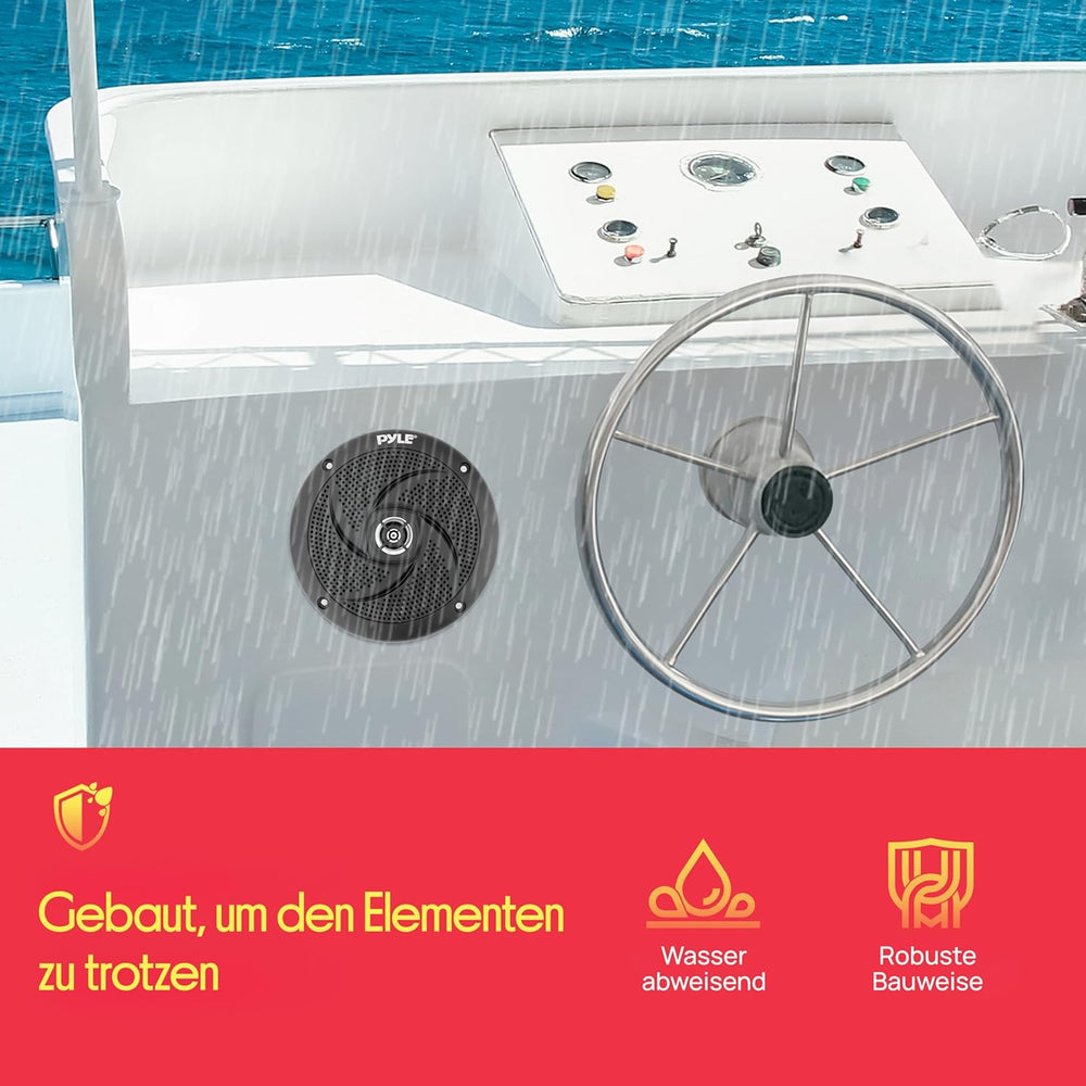 - Wetterfest: Diese wetterfesten Lautsprecher sind aus Aluminiumgehäuse für ein robustes und langlebiges Design. Sie sind auch mit ABS-gefräster Dichtung und Grill konstruiert, um Sonnenschäden durch UV-Strahlen zu bekämpfen.