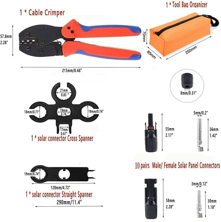 • Komplettes Werkzeug-Set: Sie erhalten: 1 x Kabel-Crimper + 10 Paar Solarpanel-Anschlüsse männlich/weiblich + 1 x Kreuzschlüssel + 1 x Solar-Stecker-Schraubenschlüssel + 1 x Reissverschluss-Werkzeugtasche + 1 x Gürtel für Sie ist bequem zu tragen,