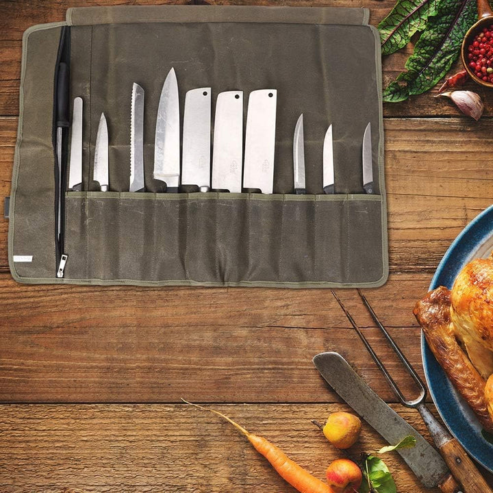 - Abmessungen: 70 x 48 cm (im aufgeklappten Zustand), mit 10 Taschen. Hält Messer bis zu einer Länge von 15 Zoll