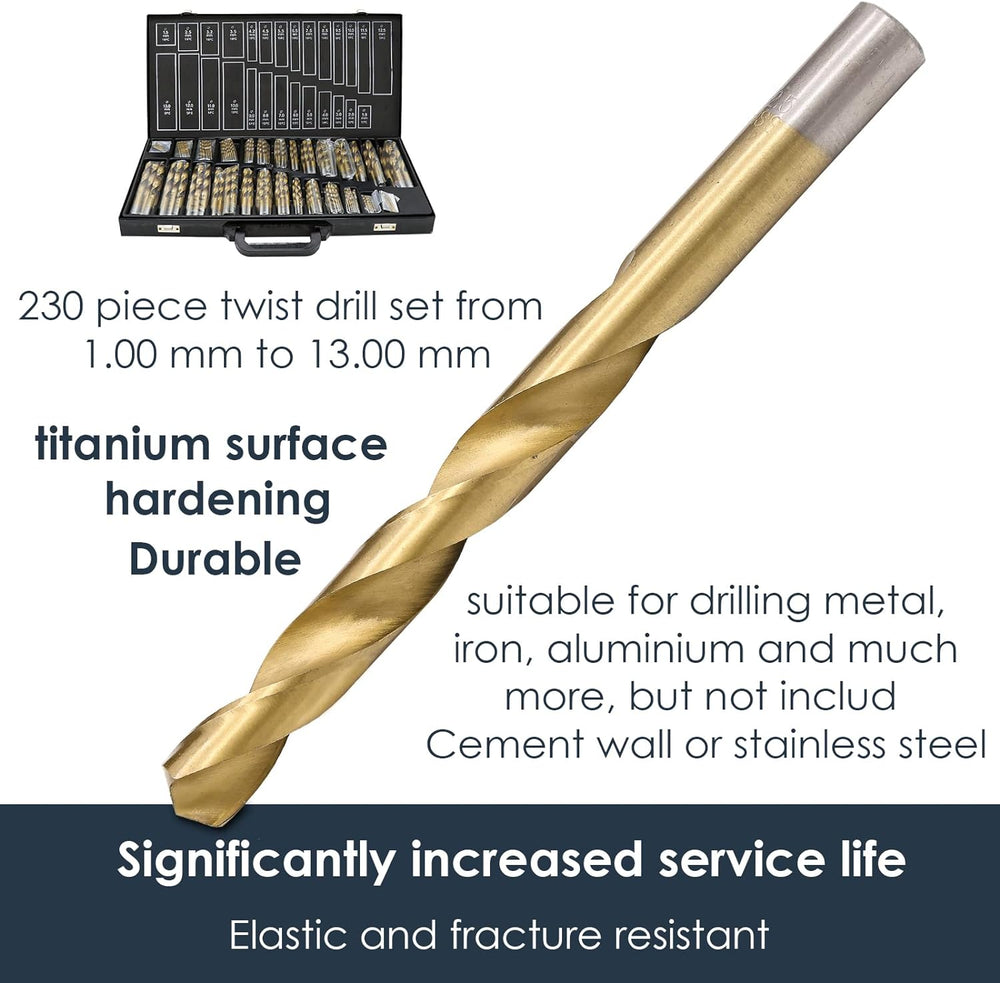 - 🛠230 Stk Metallbohrer-Set TITAN HSS TiN zum professionellen Bearbeiten von unlegiertem Stahl, Gusseisen grau, Holz, Kunststoff etc.