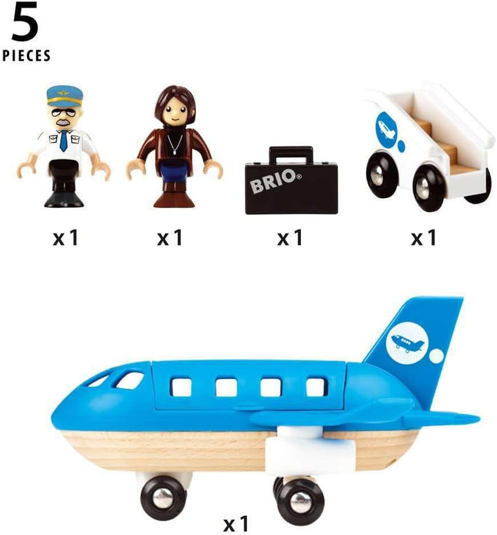 - Enthält ein blaues Flugzeug mit einer zu öffnenden Klappe, um die Passagiere, zwei bewegliche Figuren, einsteigen zu lassen, sowie eine Aussenbordtreppe und einen Koffer