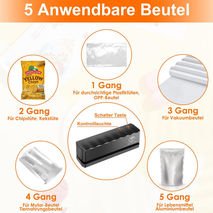 - 【Fünf Temperaturmodi】Die Beutel-Heisssiegelmaschine verfügt über 5 Einstellgänge, um Ihren Versiegelungsanforderungen für verschiedene Beutel gerecht zu werden.Der 1. Gang für durchsichtige Plastiktüten, OPP-Beutel und andere sehr dünne