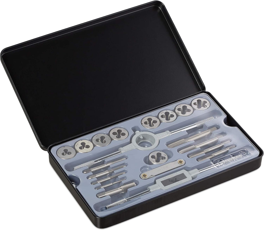 - Set: Enthält 9 Schneideisen, 9 Gewindebohrer, Windeisen, Gewindelehre, Schneideisenhalter und Koffer