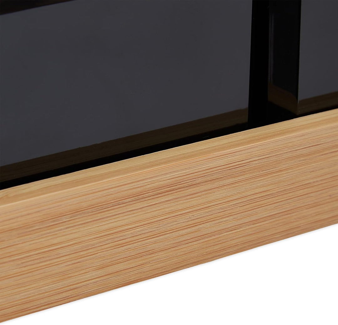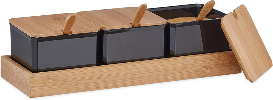 - Robust: Gewürzdosen aus schwarzem Kunststoff - Deckel, Löffel und Tablett aus natürlichem Bambus