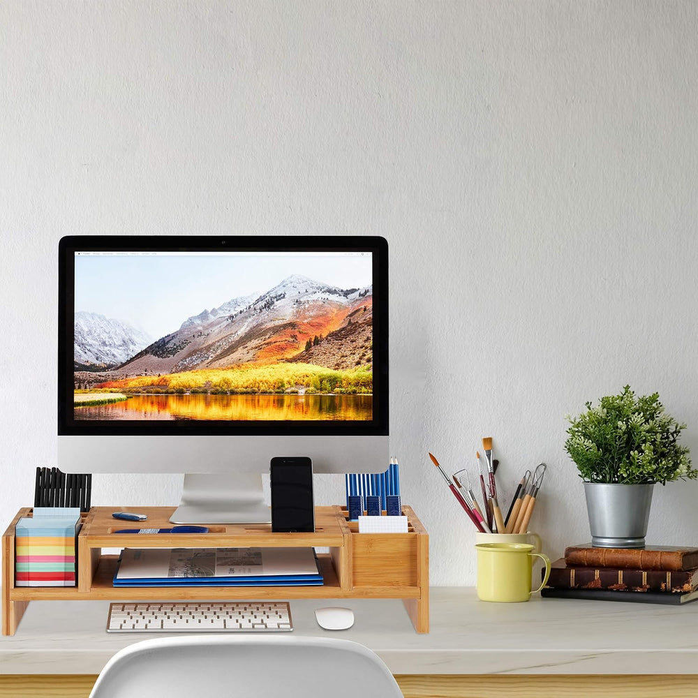 • Organizer: Platte des Monitortischs mit 3 Fächern für Handy, Stifte und mehr - Geräumige Ablage darunter